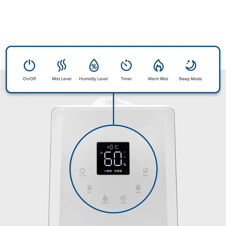 Levoit LV600S Smart Hybrid Ultrasonic Humidifier имеет удобную светодиодную сенсорную панель, которая поможет настроить основные функции. Также из любой точки мира вы можете настроить работу увлажнителя со смартфона с бесплатным приложением VeSync: включать и выключать, выбирать режим и мощность, устанавливать таймер, создавать расписание работы и т.д. А помощники Google Assistant и Amazon Alexa сделают использование очистителя еще более комфортным с голосовыми командами.