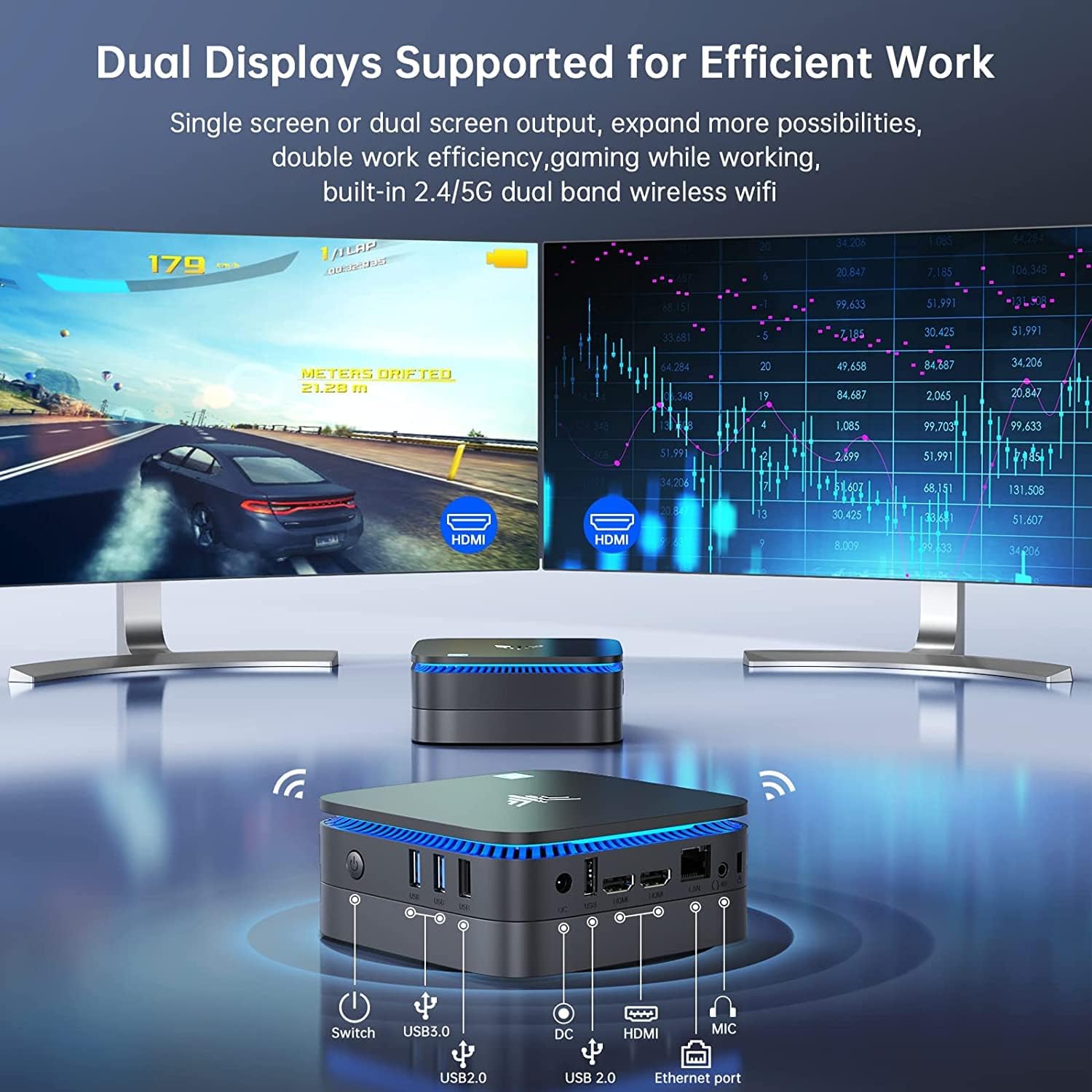 На мини-ПК есть 2 порта HDMI, вы можете подключить 2 дисплея одновременно, поддерживается разрешение 4K, он отвечает требованиям разного офисного программного обеспечения, обработки изображений, редактирования видео, создания форм. Как мультимедийное устройство, оно также предлагает вам отличный визуальный опыт. Оснащенный кронштейном VESA, вы можете установить его в любом месте.