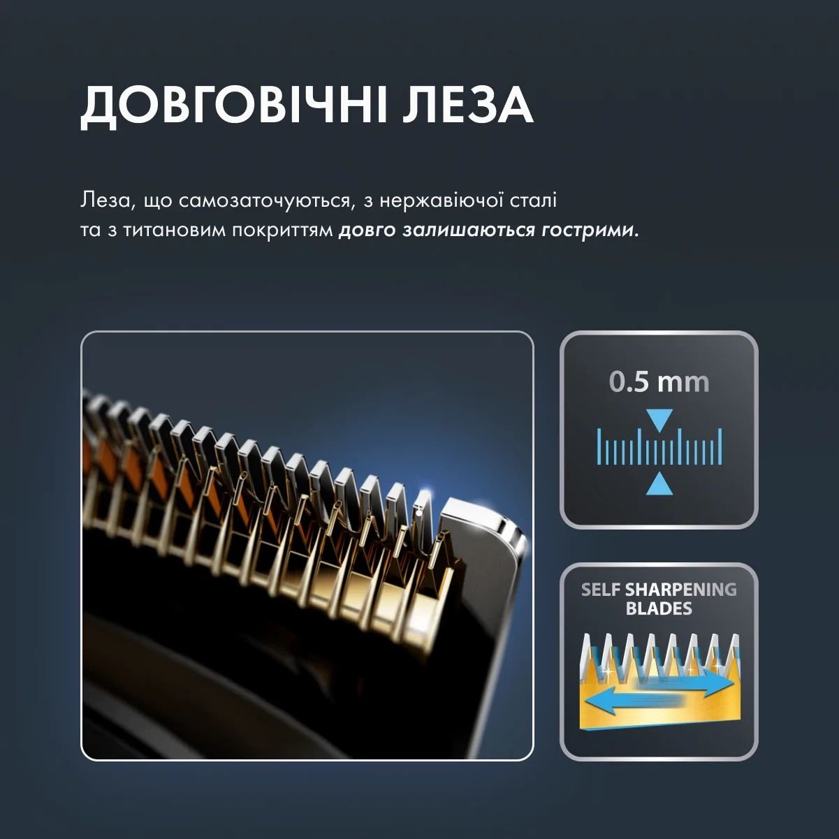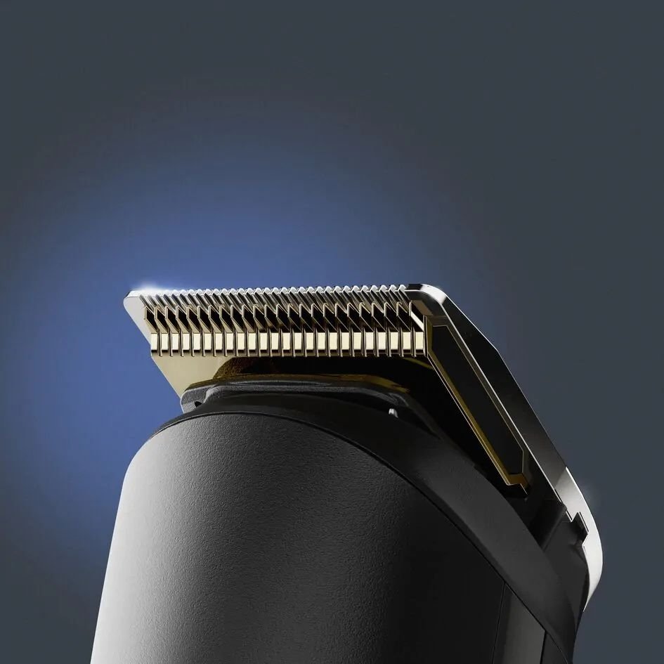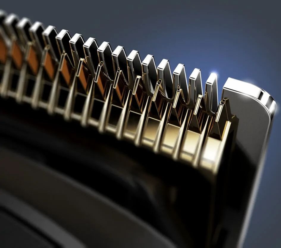 Самозатачивающиеся лезвия из нержавеющей стали с титановым покрытием долго остаются острыми и идеально точно срезают любые волосы — даже жесткие и густые.