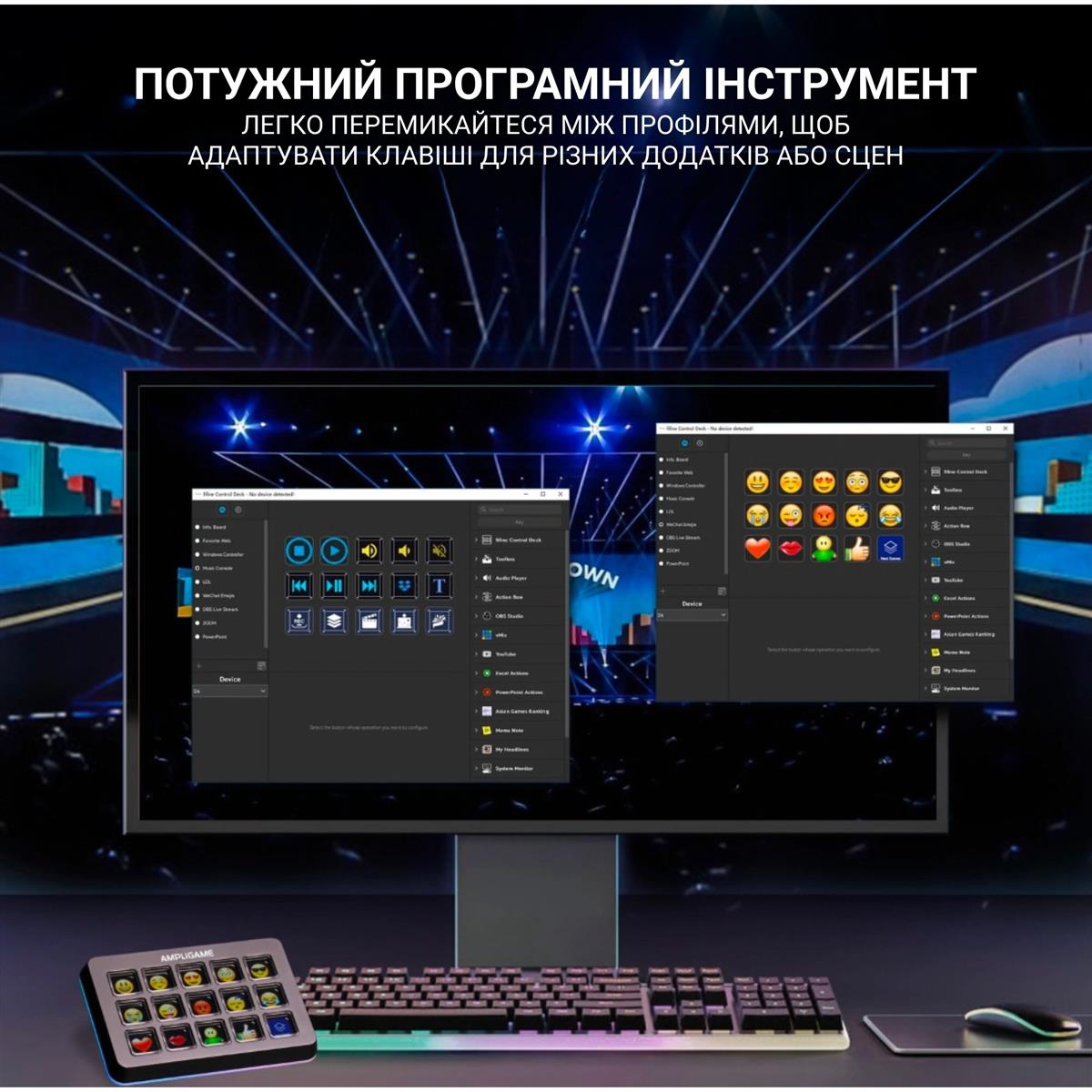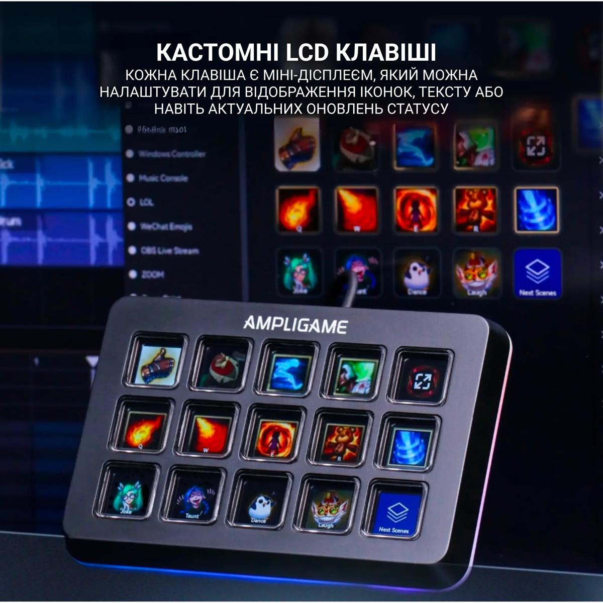 Каждая из пятнадцати кнопок оснащена мини-дисплеем, который можно адаптировать для отображения иконок, текста или актуальных системных статусов. Это обеспечивает ясное и понятное управление функциями вашего контента.