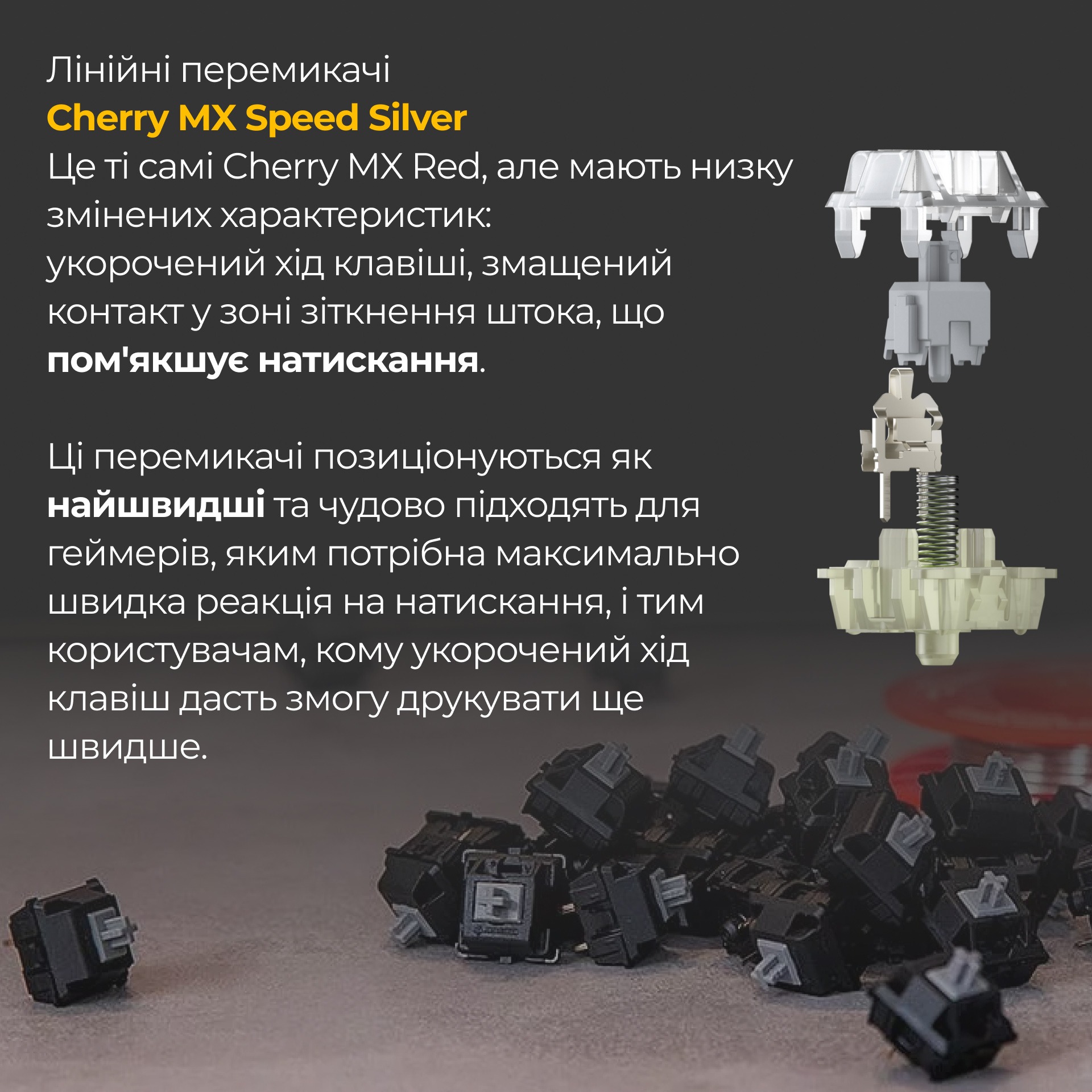 - Переключатели: Используются линейные переключатели Cherry MX Speed Silver, имеющие укороченный ход клавиши и смазанный контакт для смягчения нажатия. Это делает их идеальными для геймеров, нуждающихся в быстрой реакции.