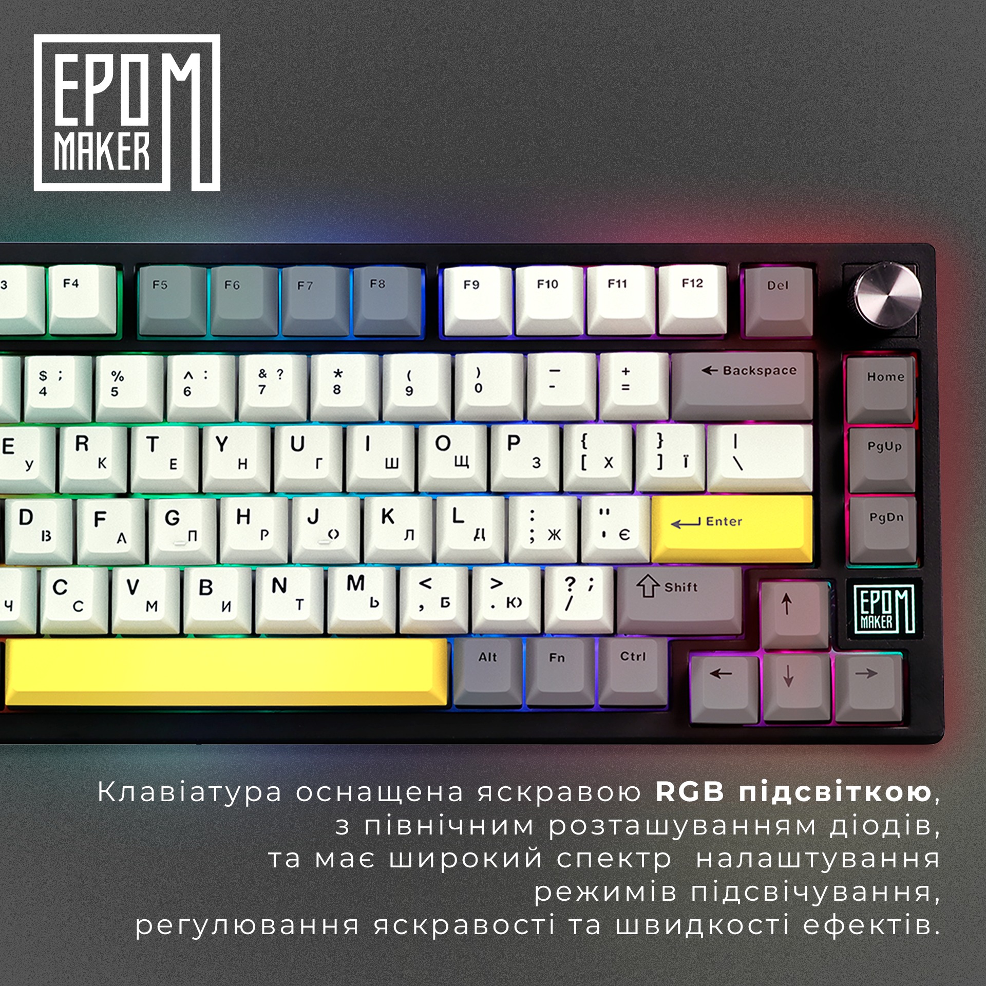 Одной из интереснейших особенностей клавиатуры является яркая RGB-подсветка, которая придает не только эстетической привлекательности, но и функциональности. Вы можете создавать различные световые эффекты, регулируя цвета и анимации в соответствии с настроением или атмосферой, которую хотите создать. Кроме того, подсветка поддерживает как украинский, так и английский алфавит, что делает клавиатуру универсальным решением для пользователей, работающих с разными языками. Подсветка не только выглядит красиво, но и придает удобства, особенно при низком освещении.
