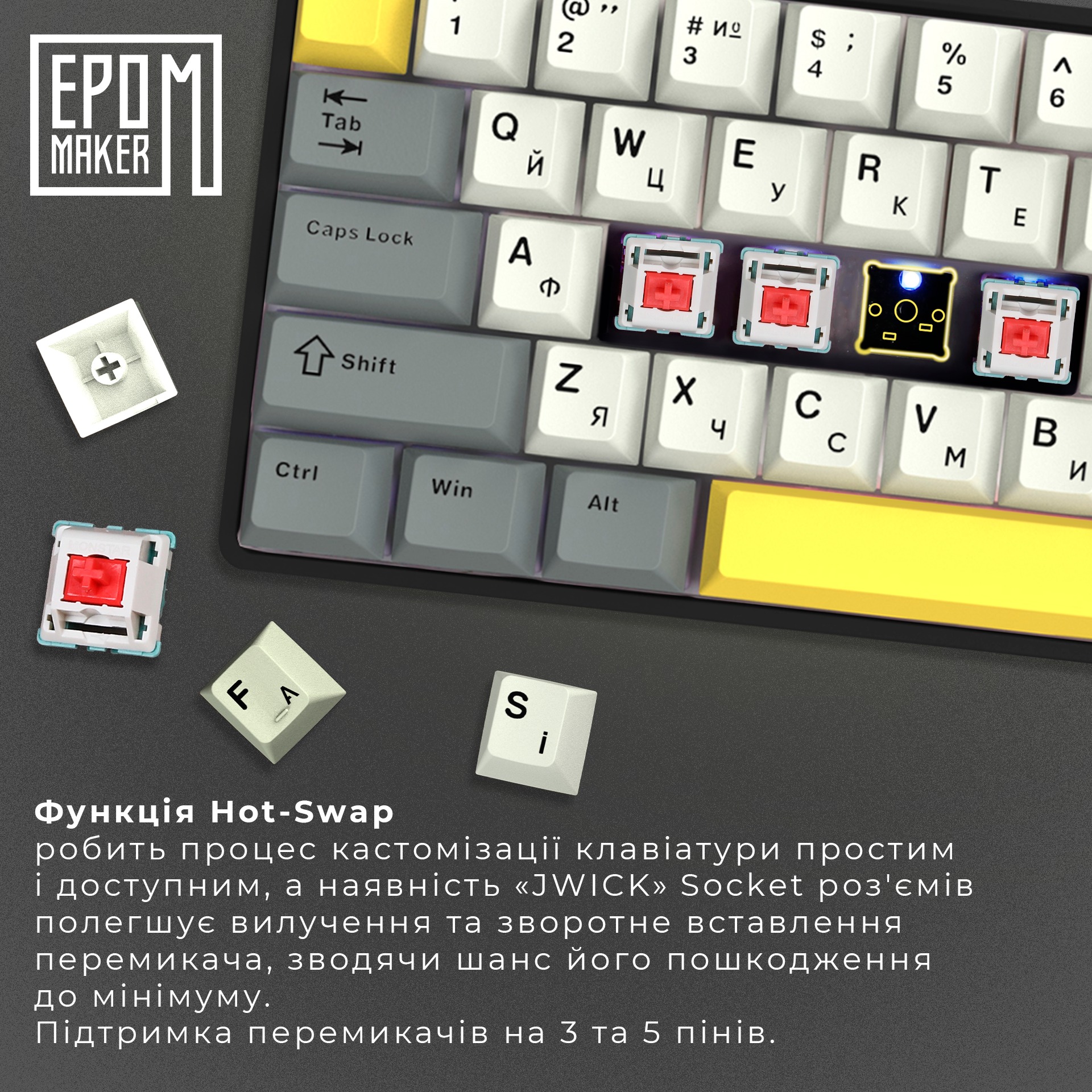 Беспроводная механическая клавиатура EP64 сочетает в себе инновационные технологии, делающие ее отличным выбором для пользователей, ищущих удобство, производительность и высокий уровень персонализации. Одним из основных преимуществ является технология Hot-Swap из Socket, позволяющая менять переключатели без пайки. Благодаря этому, вы можете легко настроить клавиатуру под свои индивидуальные предпочтения, выбирая переключатели, наиболее соответствующие вашему стилю набора текста или игр. Это открывает безграничные возможности для кастомизации, что делает клавиатуру настоящим инструментом для ценящих детали.
