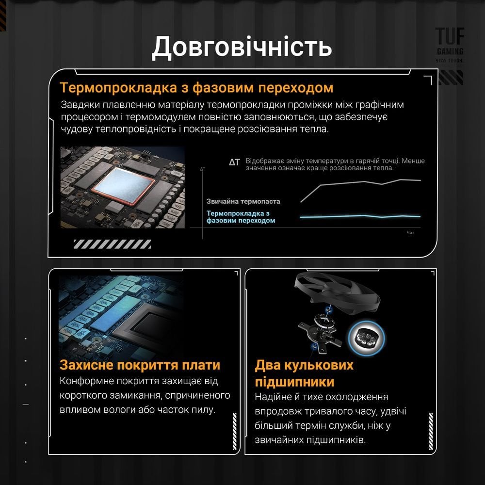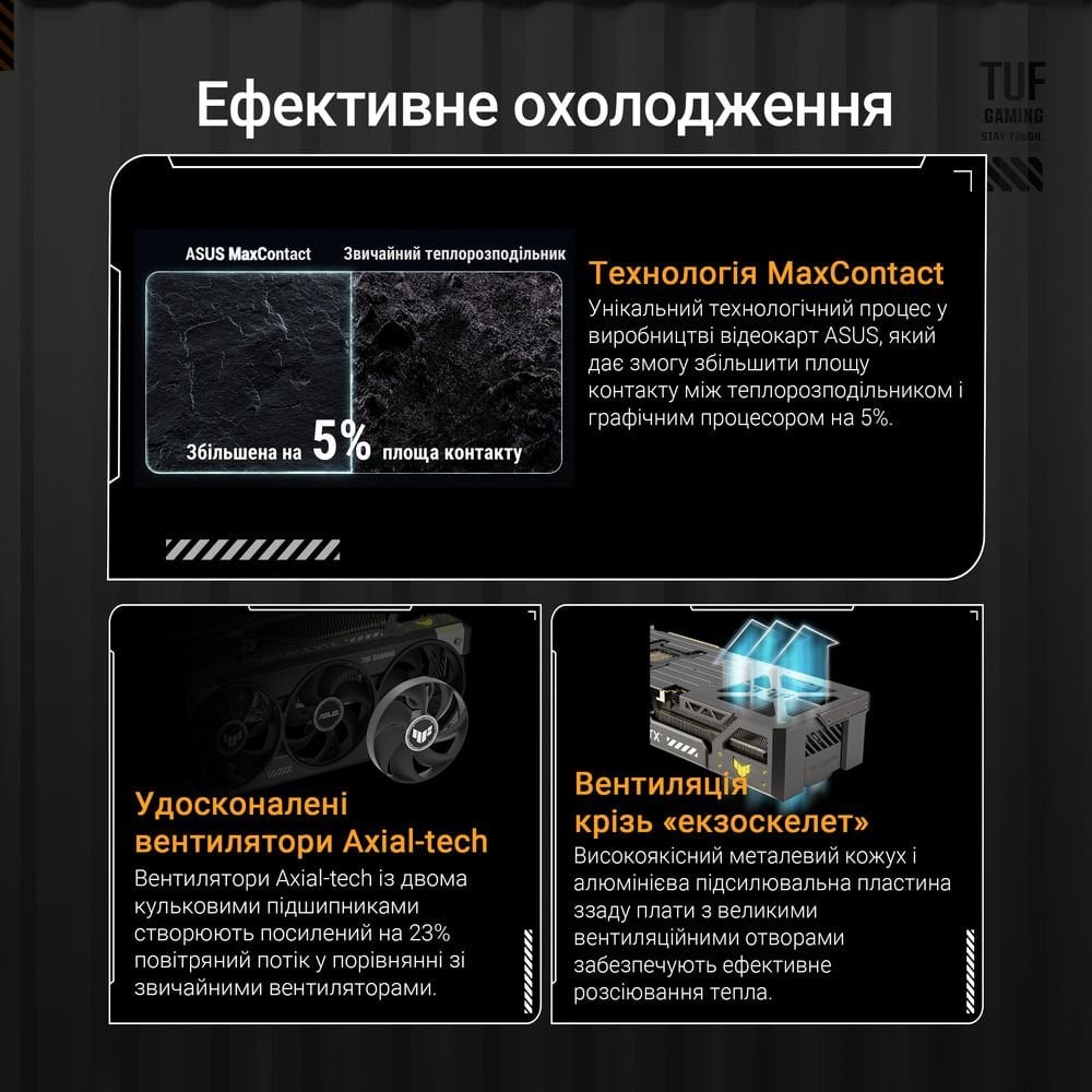 Передовой дизайн системы охлаждения включает в себя эксклюзивную технологию ASUS MaxContact, фазосдвигающую термопрокладку GPU и эффективные вентиляторы Axial-tech, обеспечивающие превосходные тепловые характеристики, оптимизированный воздушный поток и бесшумную работу, и все это в прочном и вентилируемом металлическом корпусе.