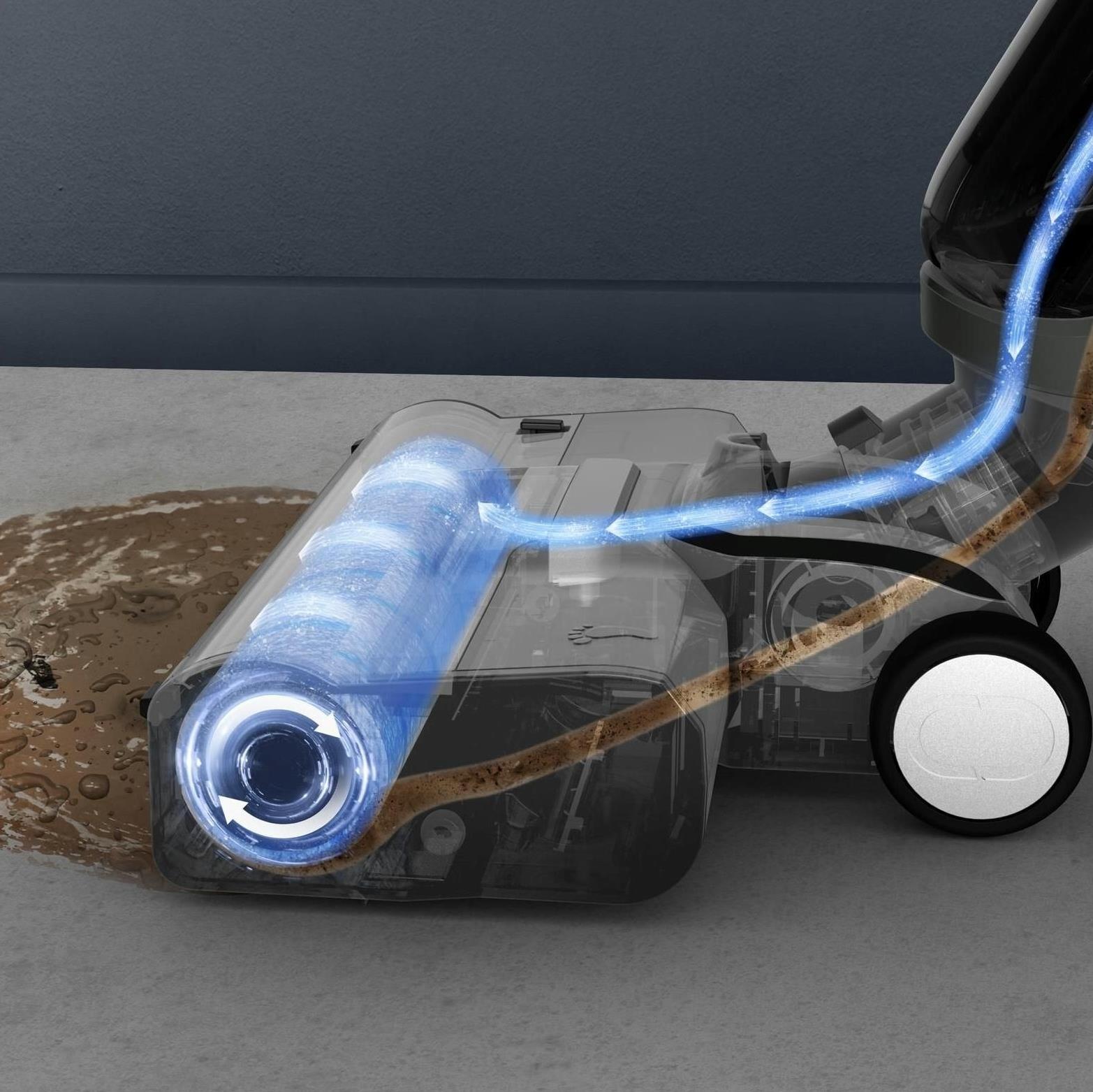 Пылесос автоматически меняет воду в системе. Чистая вода постоянно поступает в щеточный валик, что обеспечивает безупречные результаты уборки, тогда как грязная вода всасывается обратно во второй изолированный резервуар. Именно поэтому он достигает идеальных результатов. Нет грязи - нет разводов.