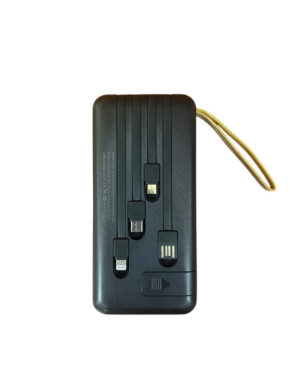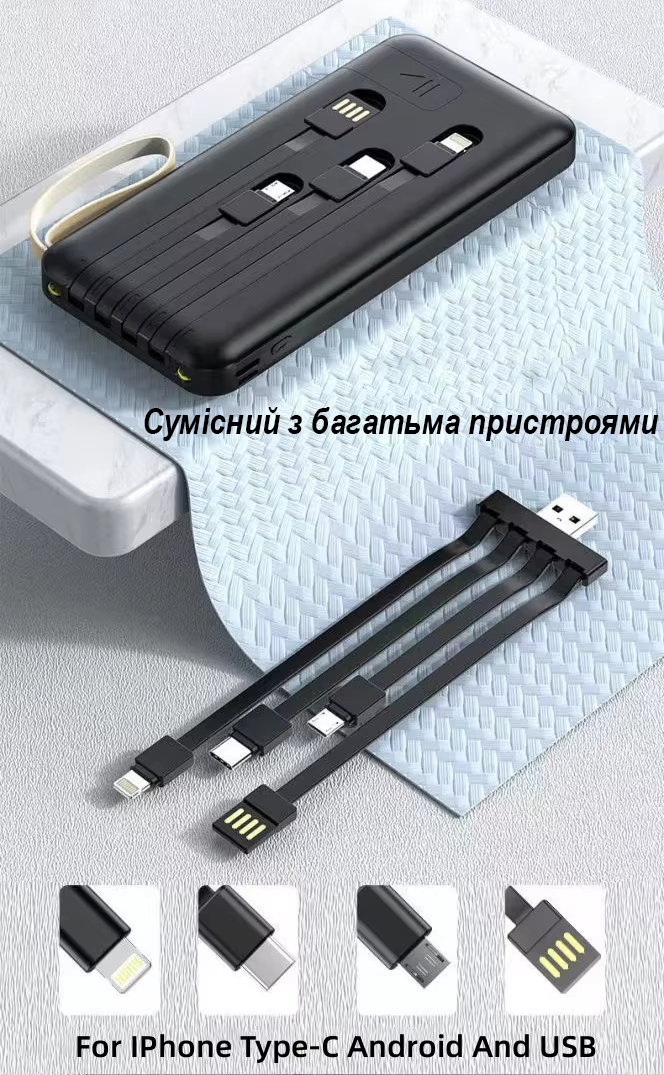 С тыльной стороны корпуса спрятаны короткие кабели. Один из них с USB штекером предназначен для подзарядки самого устройства, а остальные – Lightning, micro-USB, Type-C для подзарядки телефона. Помимо перечисленных интерфейсов у power bank есть выходной USB и входной USB Type-C, micro-USB.