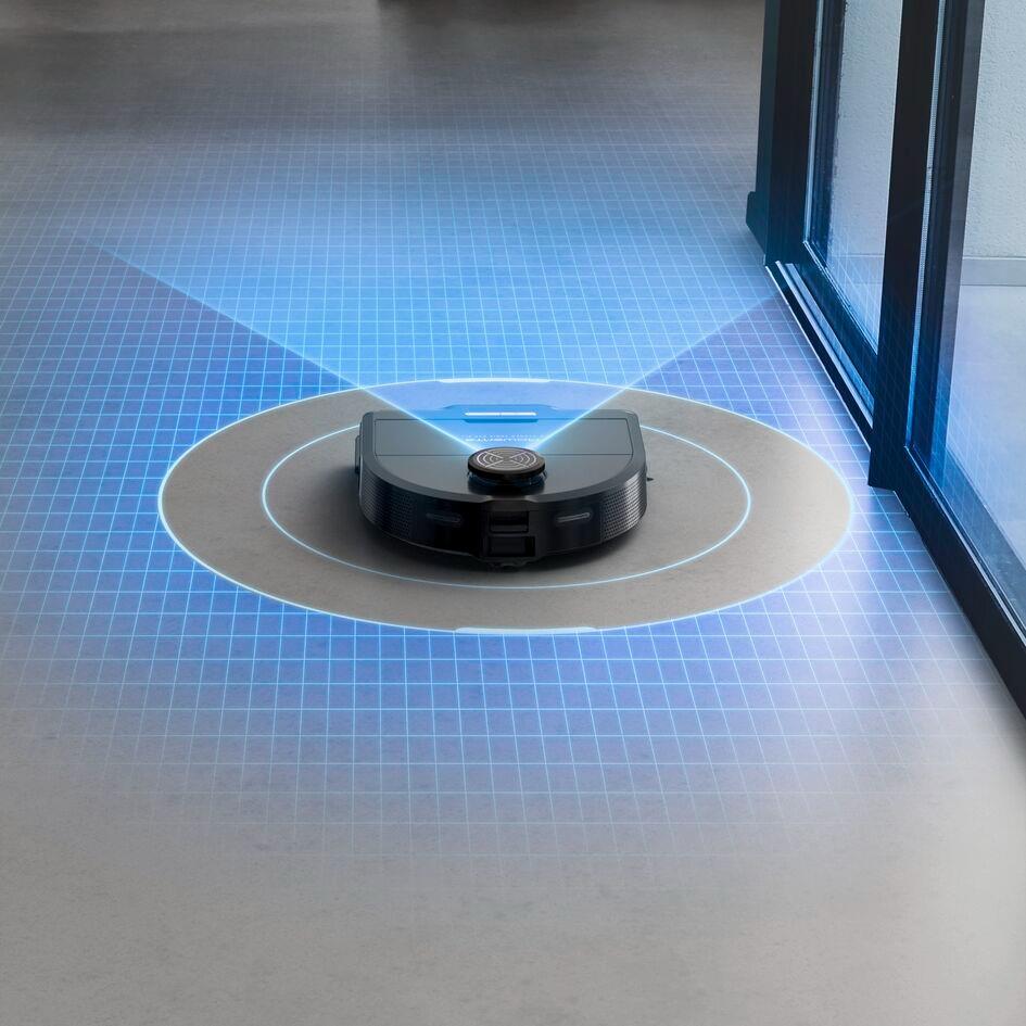 Робот-пылесос охватывает до 120 м2 за один проход и возвращается к док-станции для подзарядки перед автоматическим возобновлением уборки.