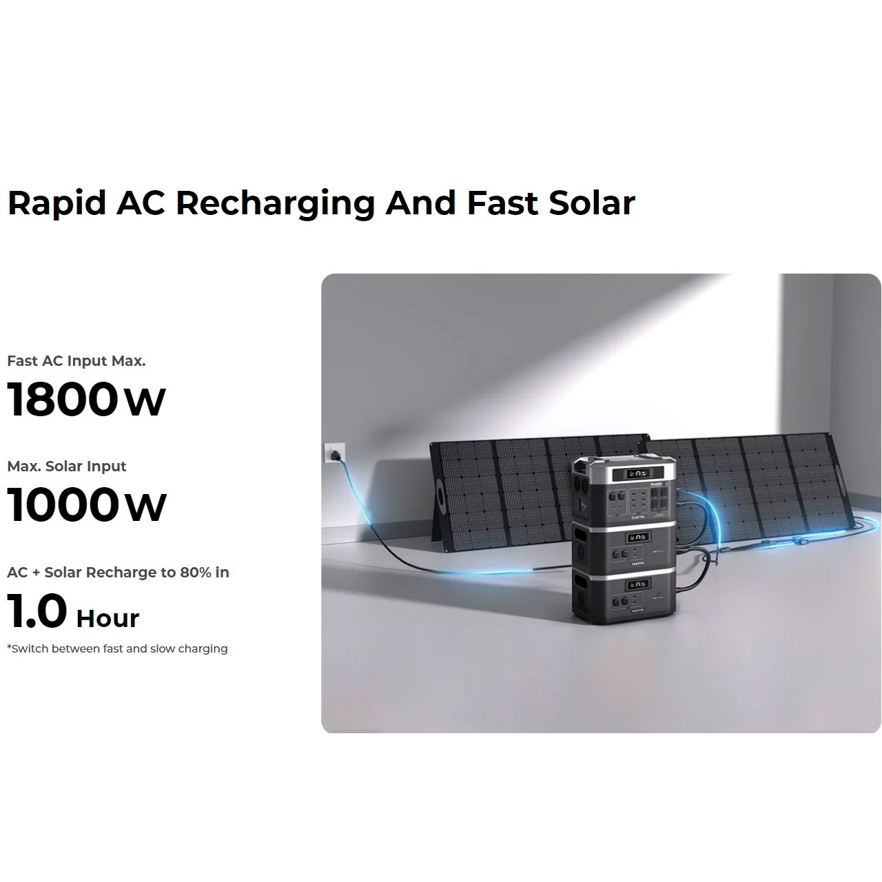 BP2000 Pro заряжается от 0 до 80% за 1.5 часа с максимальной мощностью 1800 Вт. Вход переменного тока или двойная зарядка PV1000W + AC1500W до 80% всего за 1 час, что позволит вам начать использовать его снова за короткое время.