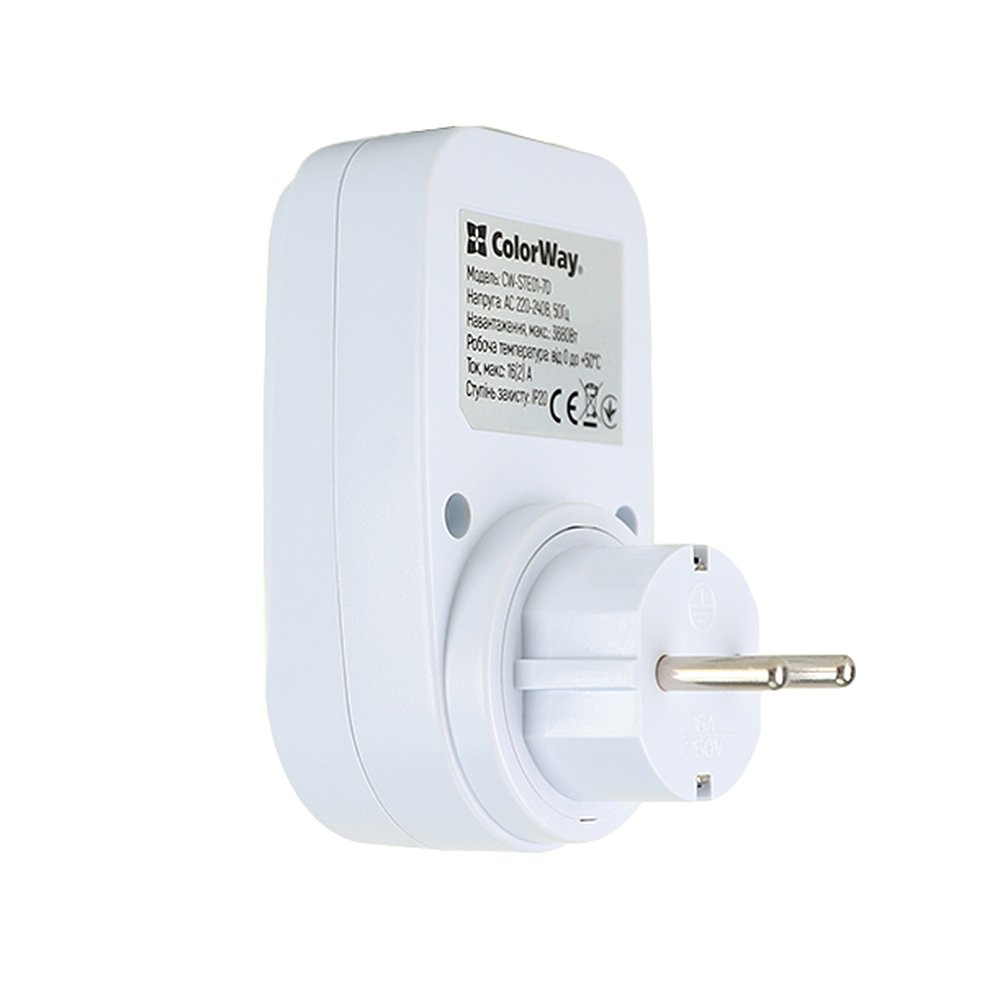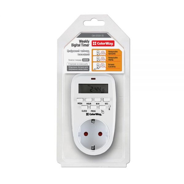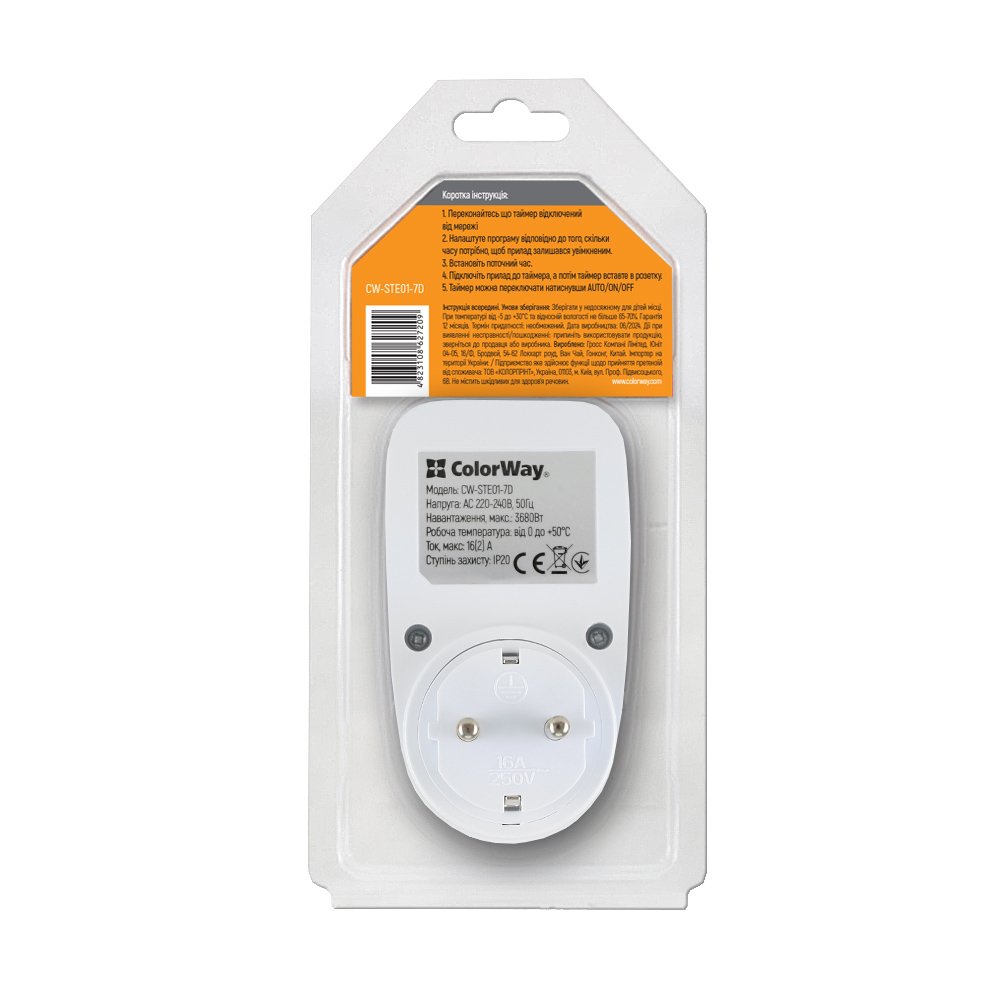 Характеристики Таймер-розетка ColorWay (16A/3680W) электронный недельный 7D (CW-STE01-7D)