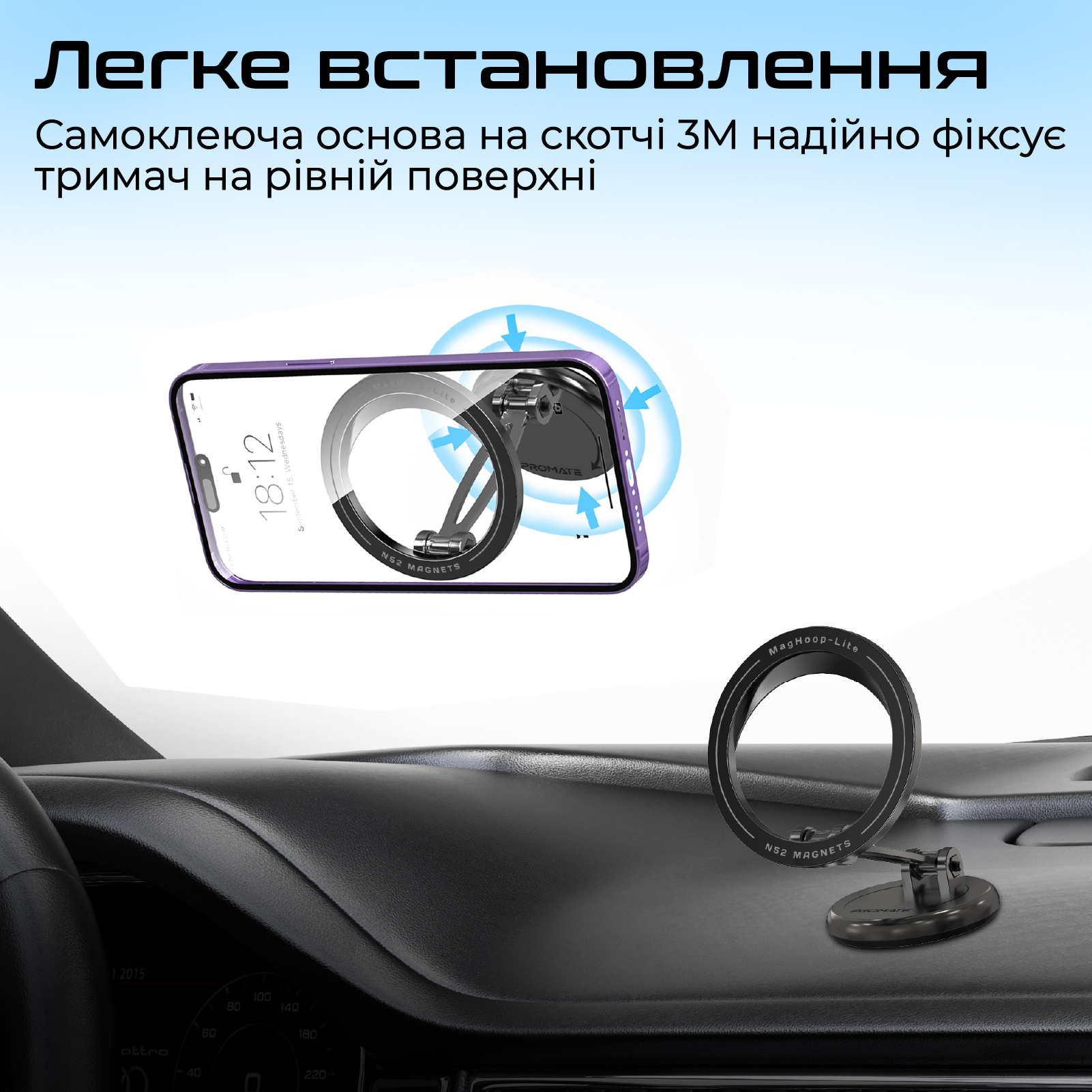 MagHoop-Lite – автодержатель из новой линейки от Promate, отличается передовым дизайном в виде магнитного кольца и металлической конструкцией.