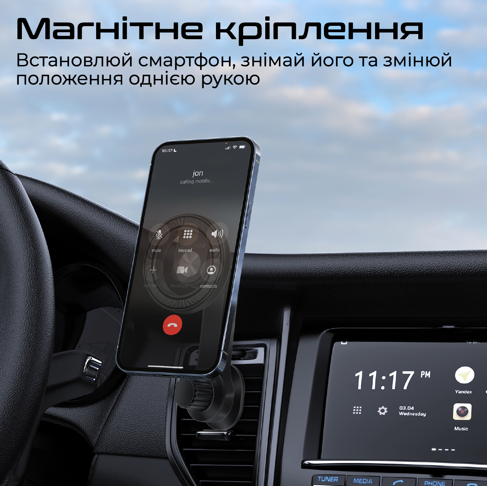- Магнитный крепеж: Устанавливай смартфон на держатель, снимай его и меняй вертикальное положение на горизонтальное одной рукой