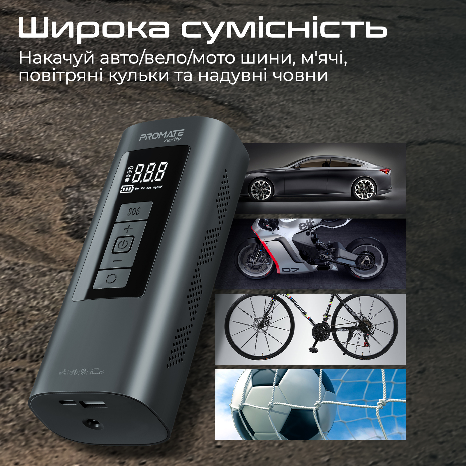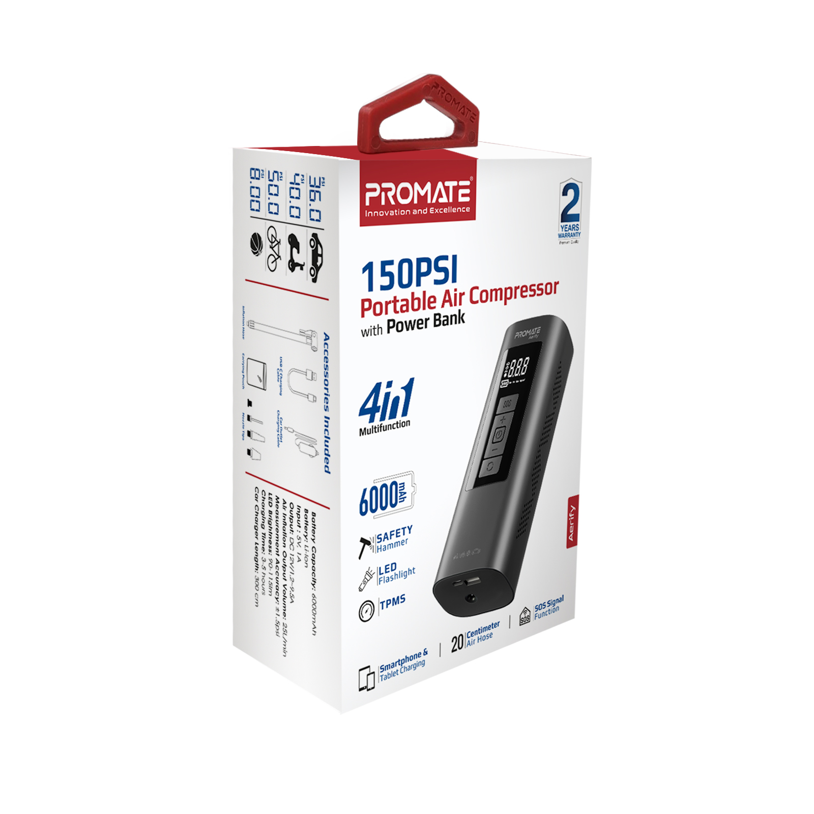 Насос, повербанк на 6000 мА/ч, LED фонарик и аварийный молоток. Promate Aerify – многофункциональный компрессор 4 в 1, который станет незаменимым помощником для каждого автомобилиста.