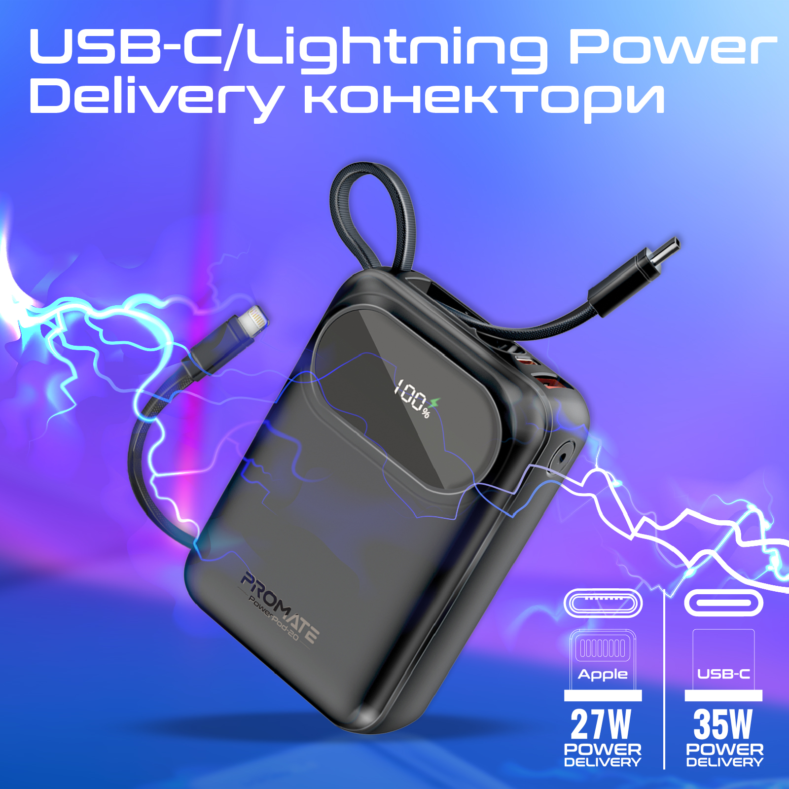 Promate PowerPod-20 – улучшенная версия популярной модели PowerPod-10 от Promate. Мощность повербанка 20000 мАч, 2 встроенных кабеля, 2 порта с поддержкой Power Delivery и все это в компактном корпусе.