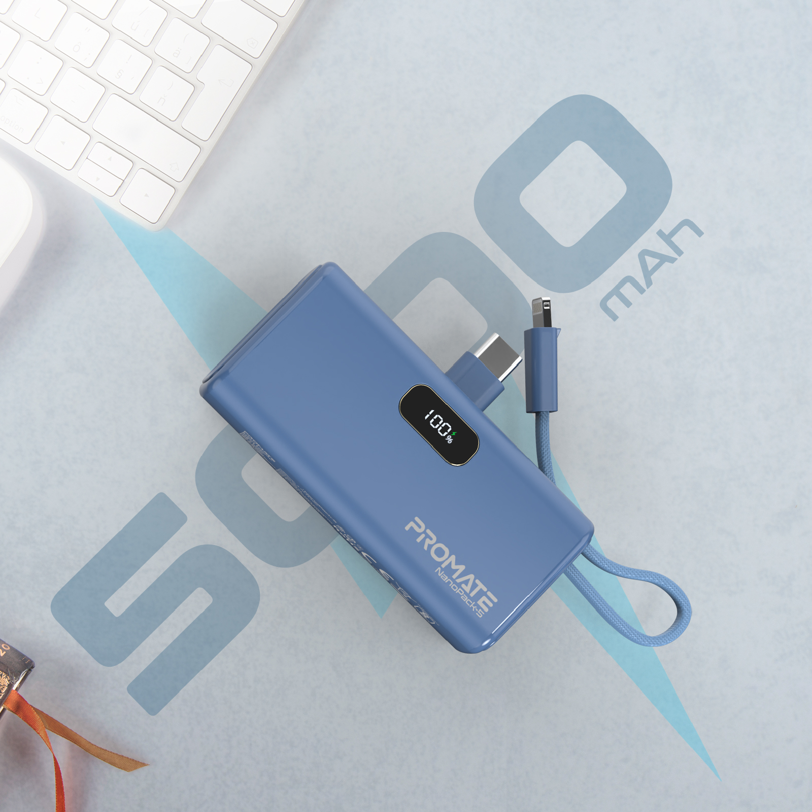Nanopack-5 от Promate – миниатюрный повербанк на 5000 мАч с поддержкой 20 Вт Power Delivery быстро зарядит твой смартфон. LED дисплей, встроенный Lightning кабель и откидной упор добавят удобства в повседневном использовании.