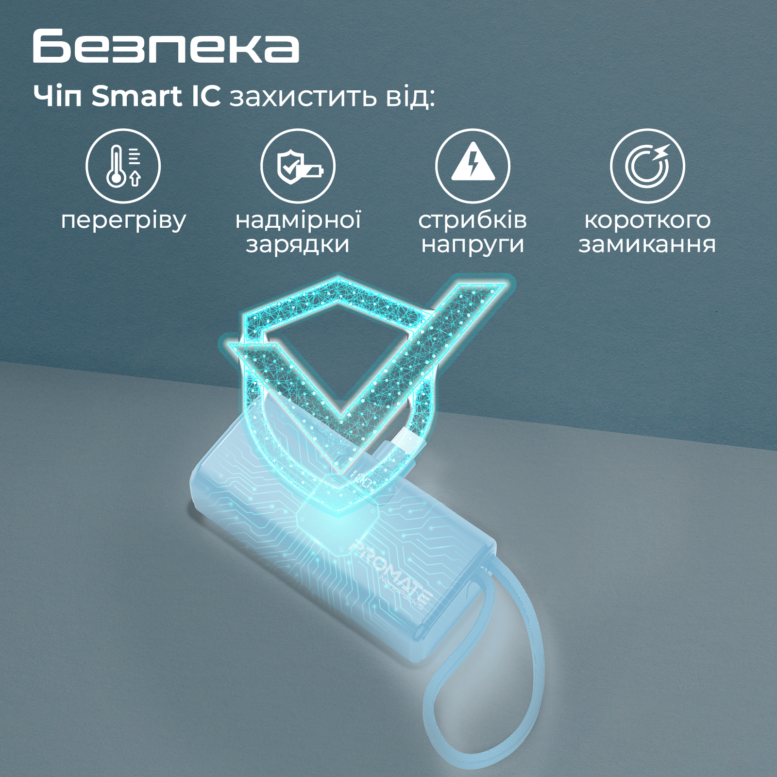 - Безопасность: Встроенный чип Smart IC защищает повербанк и подключенные к нему устройства от перегрева, скачков напряжения, короткого замыкания и чрезмерной зарядки.