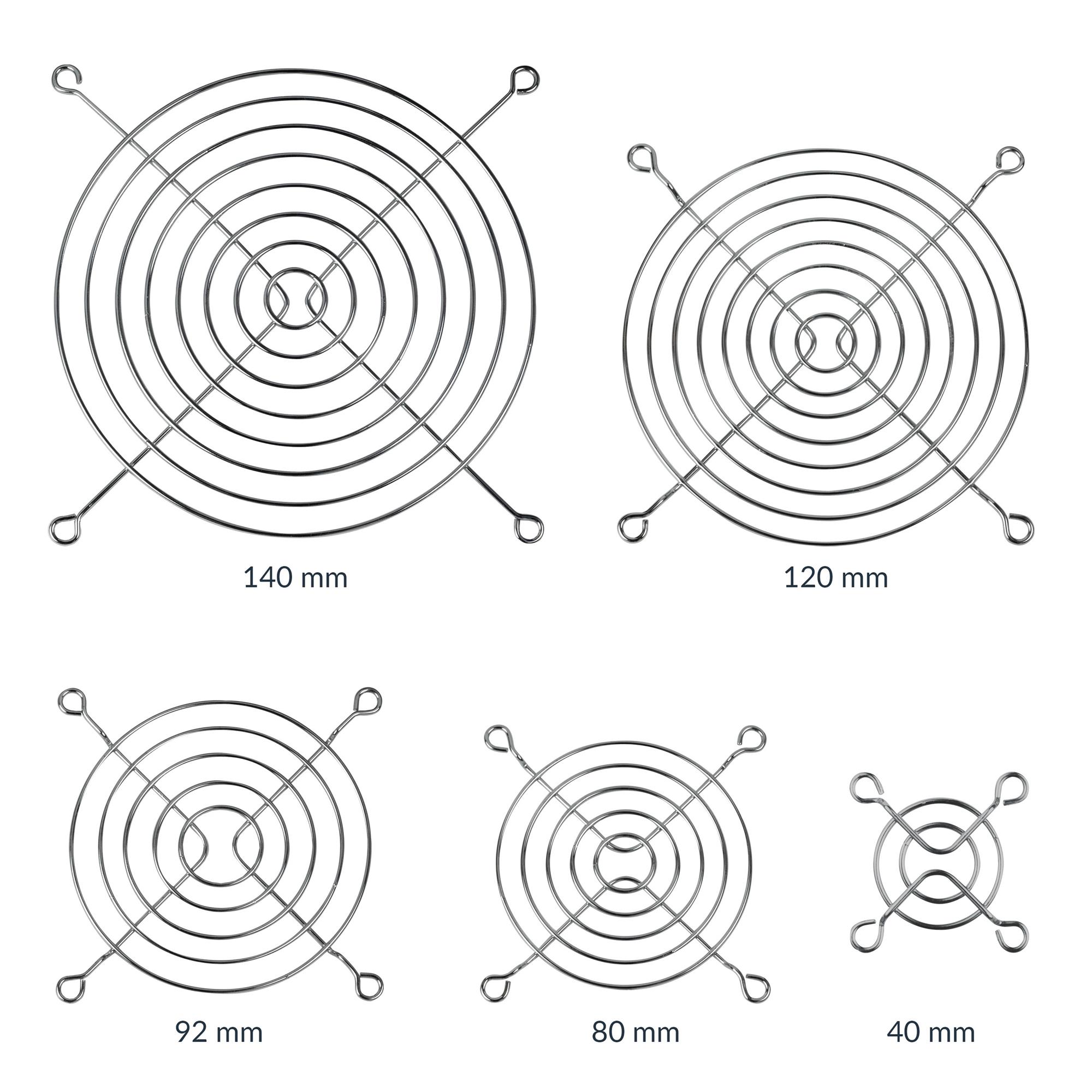 Наши вентиляторные решетки доступны в четырех различных размерах: 40 мм, 80 мм, 92 мм, 120 мм и 140 мм.