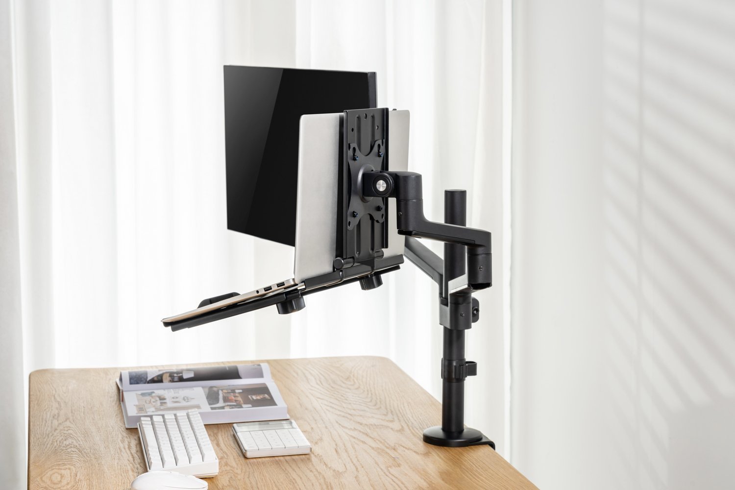 Держатель для ноутбука LH524B представляет собой популярный выбор для режимов работы с двойным экраном, обеспечивая функцию двухуровневой регулировки высоты и совместимость с шарнирными кронштейнами монитора. Его можно удобно сложить, чтобы сэкономить место, когда он не используется. Также он имеет регулируемую глубину для размещения устройств от 12 до 17 дюймов. Благодаря вентилируемой панели держатель обеспечивает эффективное рассеяние тепла, предотвращая перегрев во время длительного использования ноутбука. В общем, LH524B предлагает универсальное и эффективное решение для выравнивания экранов, регулировки высоты и повышения производительности в настройках с двумя экранами.