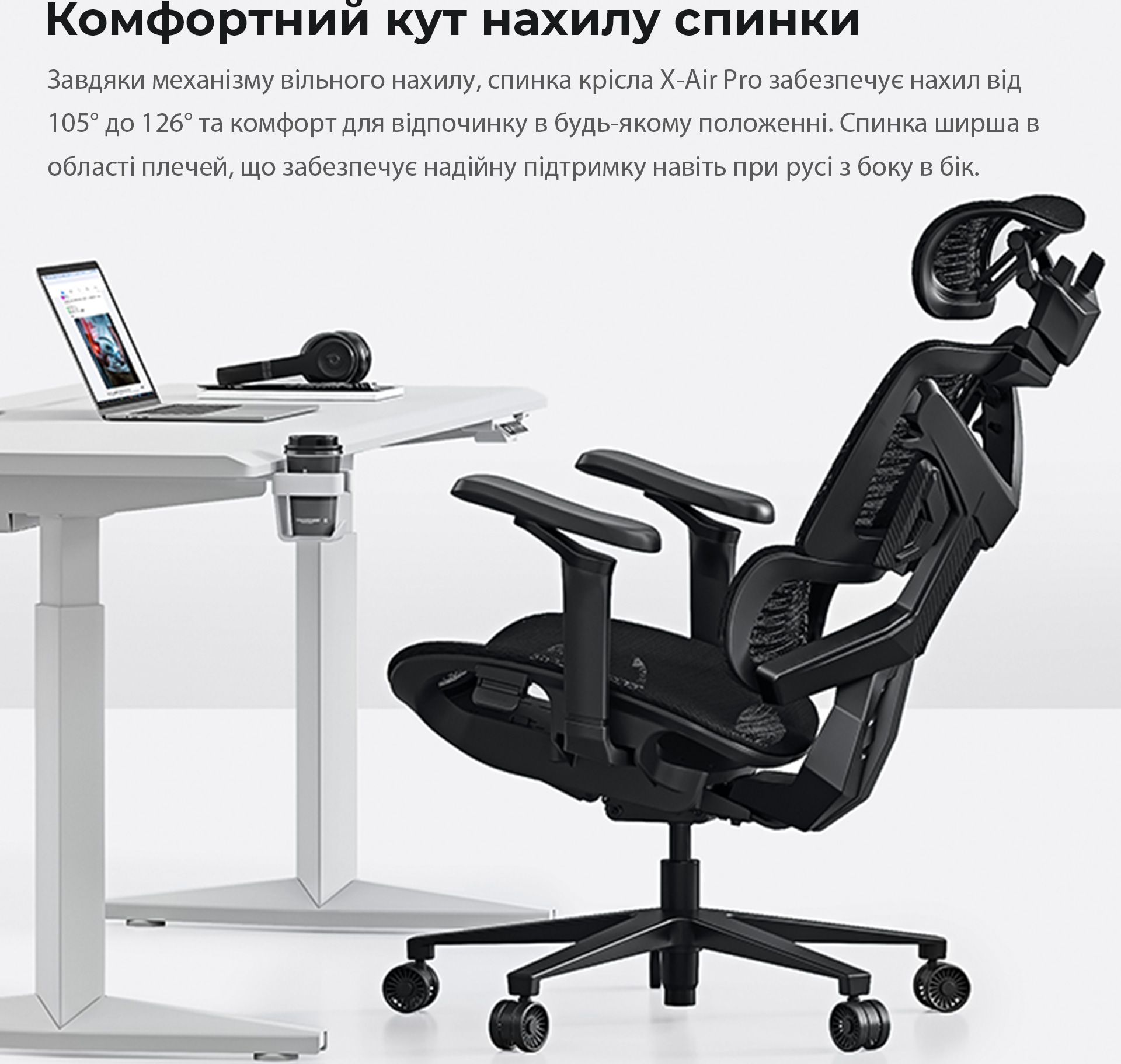 Спинка оснащена механизмом свободного наклона и регулируется в диапазоне от 105 до 126°, обеспечивая комфорт в любом положении. Более широкая в области плеч, она оказывает надежную поддержку даже во время боковых движений.