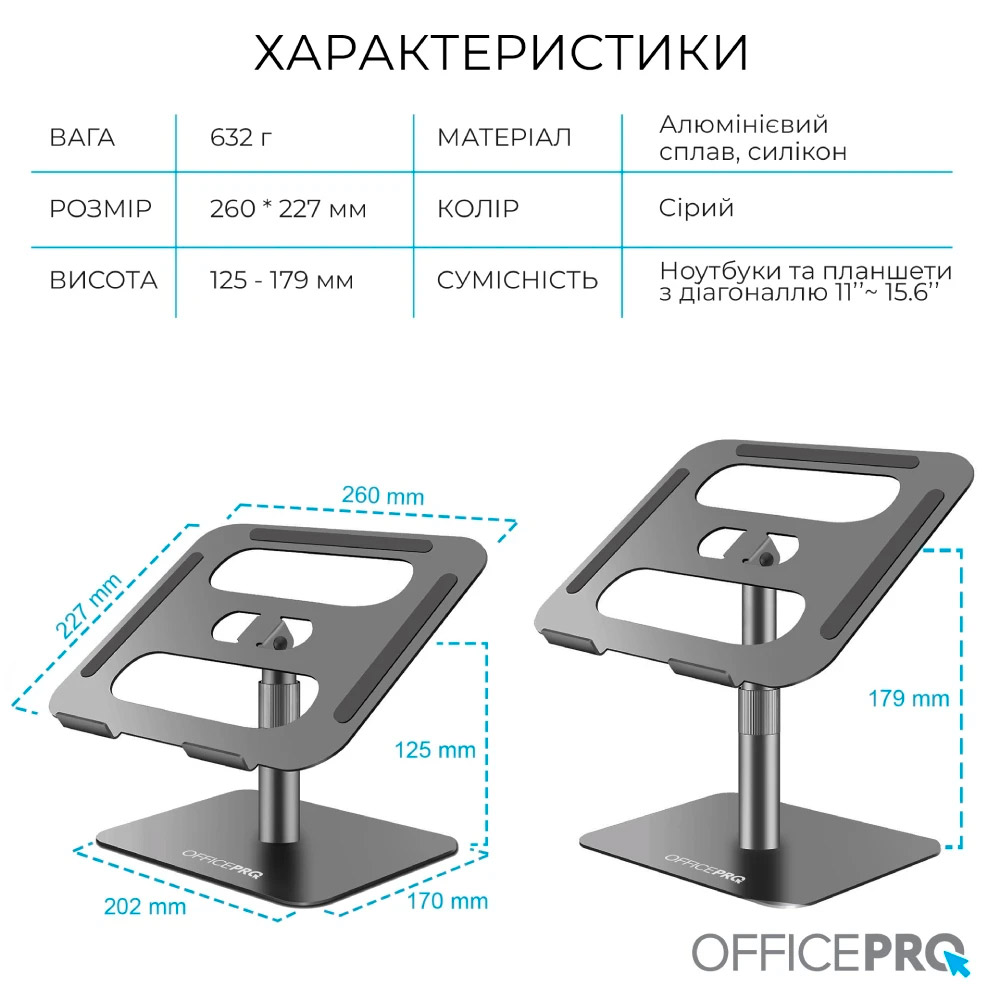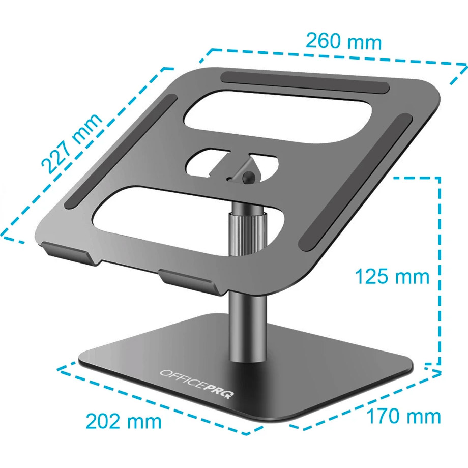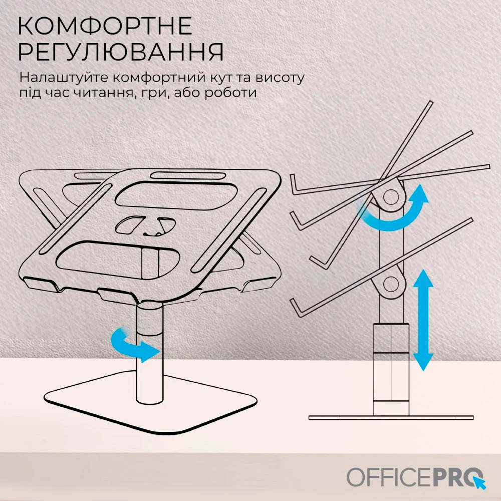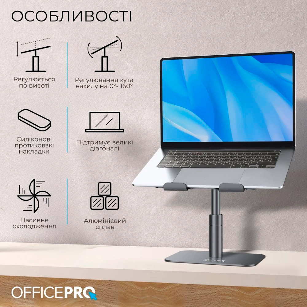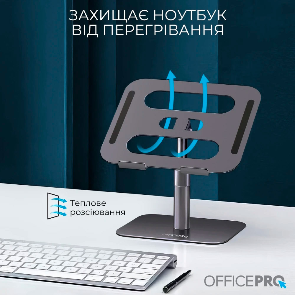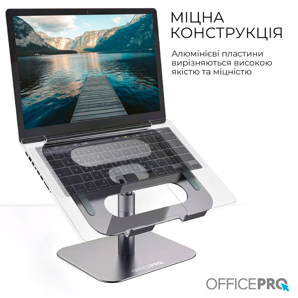 OfficePro LS956G – металлическая подставка для ноутбука с плавной регулировкой высоты и ориентации на 360°. Удобная конструкция позволяет расположить экран под оптимальным углом обзора, обеспечивая полный доступ ко всем его портам и функциям. Это делает подставку идеальным выбором для динамической работы и презентаций.