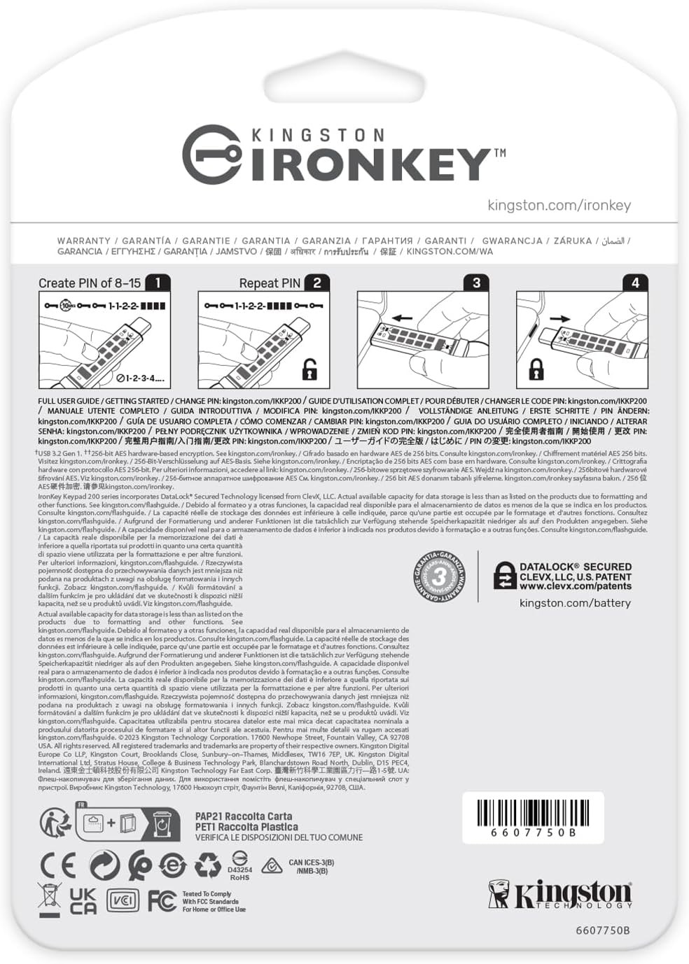 Kingston IronKey Keypad 200 — это не зависящий от ОС USB-накопитель с аппаратным шифрованием, оснащенный буквенно-цифровой клавиатурой для удобного доступа с помощью PIN-кода.