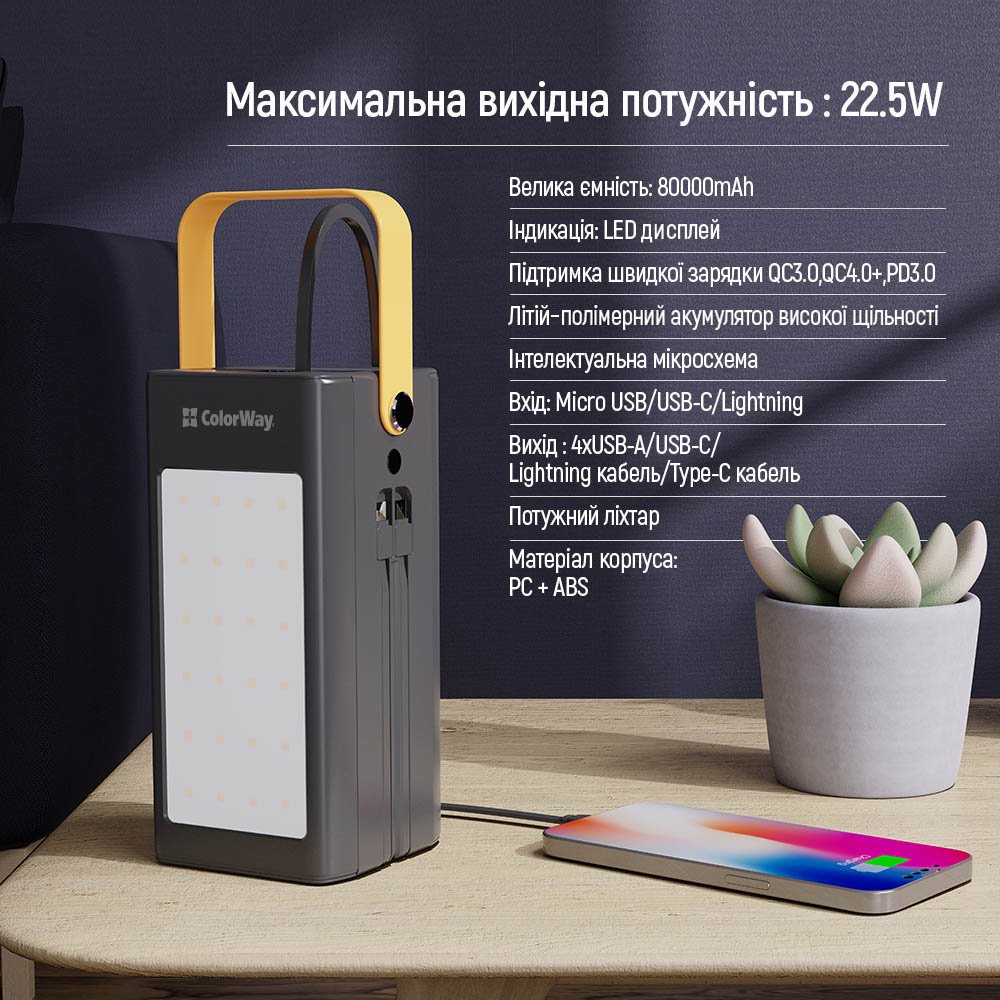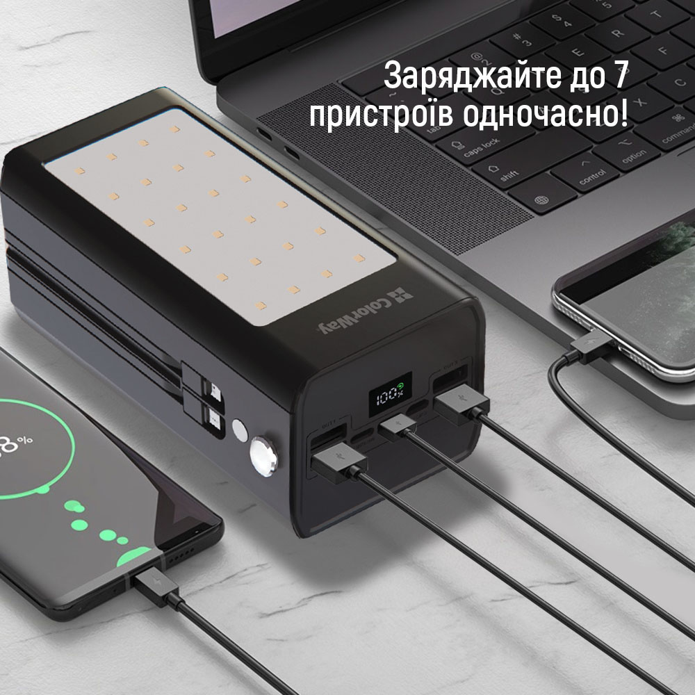 Внешний мобильный аккумулятор ColorWay на 80000mAh – это надежное решение для питания ваших гаджетов в любых условиях. Благодаря большой емкости вы сможете пользоваться устройствами несколько дней без подзарядки, что особенно удобно во время путешествий, походов или перебоев с электроснабжением. Мощность до 22.5 Вт обеспечивает быстрое зарядное устройство для смартфонов и других устройств, а поддержка современных протоколов (Power Delivery 3.0, Quick Charge 2.0/3.0/4.0+, Huawei Fast Charge, Huawei Super Charge, Samsung Fast Charge, Apple Fast Charge, MTK-PE+ 2.0) гарантирует высокую эффективность. Аккумулятор оснащен разъемами Type-C, Lightning, micro USB и 5 выходными портами (4xUSB-A, Type-C), а также двумя встроенными кабелями Lightning и Type-C длиной 15 см, что исключает необходимость в дополнительных аксессуарах. Возможность одновременно заряжать до 7 устройств делает этот павербанк незаменимым как в повседневной жизни, так и в поездках. Интегрированный LED-дисплей позволяет легко отслеживать уровень заряда, а силиконовый шнурок обеспечивает удобное крепление к рюкзаку или сумке. Для вашей безопасности устройство имеет защиту от перегрева, перезаряда, глубокого разряда, перегрузки и короткого замыкания. Дополнительно павербанк оснащен мощным фонарем, который пригодится во время кемпинга или активного отдыха. ColorWay 80000mAh – идеальное решение, обеспечивающее непрерывный доступ к энергии и свету, где бы вы ни находились.