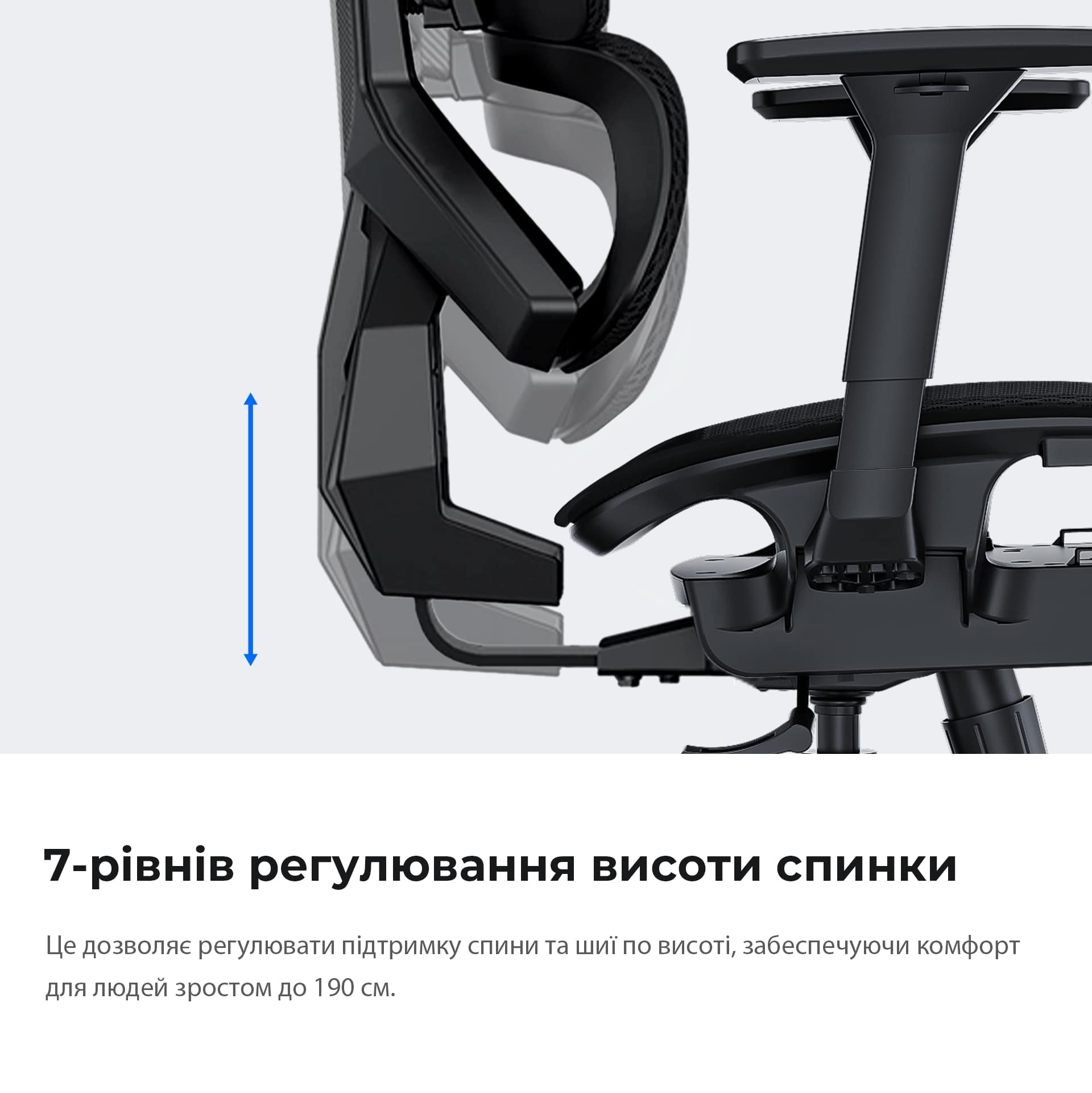 Кресло оснащено 4D подлокотниками, 3D подголовником и 8-сантиметровой регулировкой высоты спинки с 7 уровнями, что позволяет настроить комфорт и поддержку в соответствии с вашими потребностями.