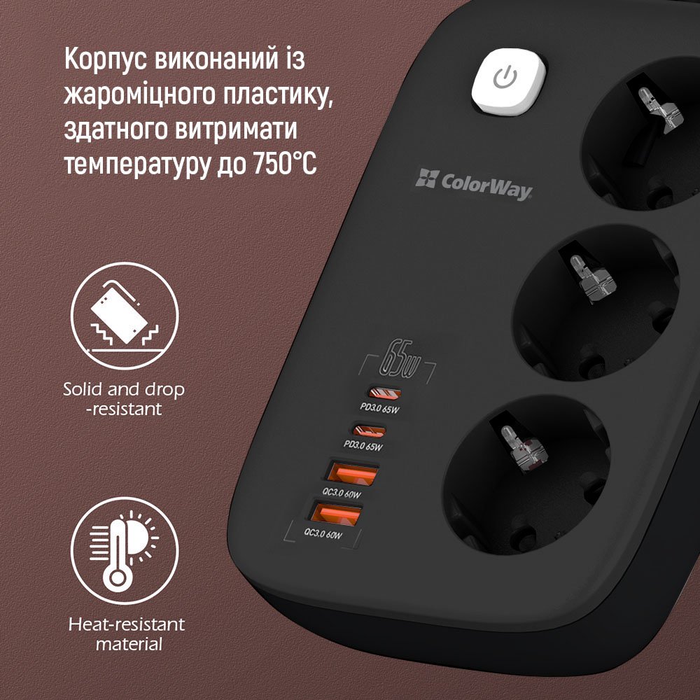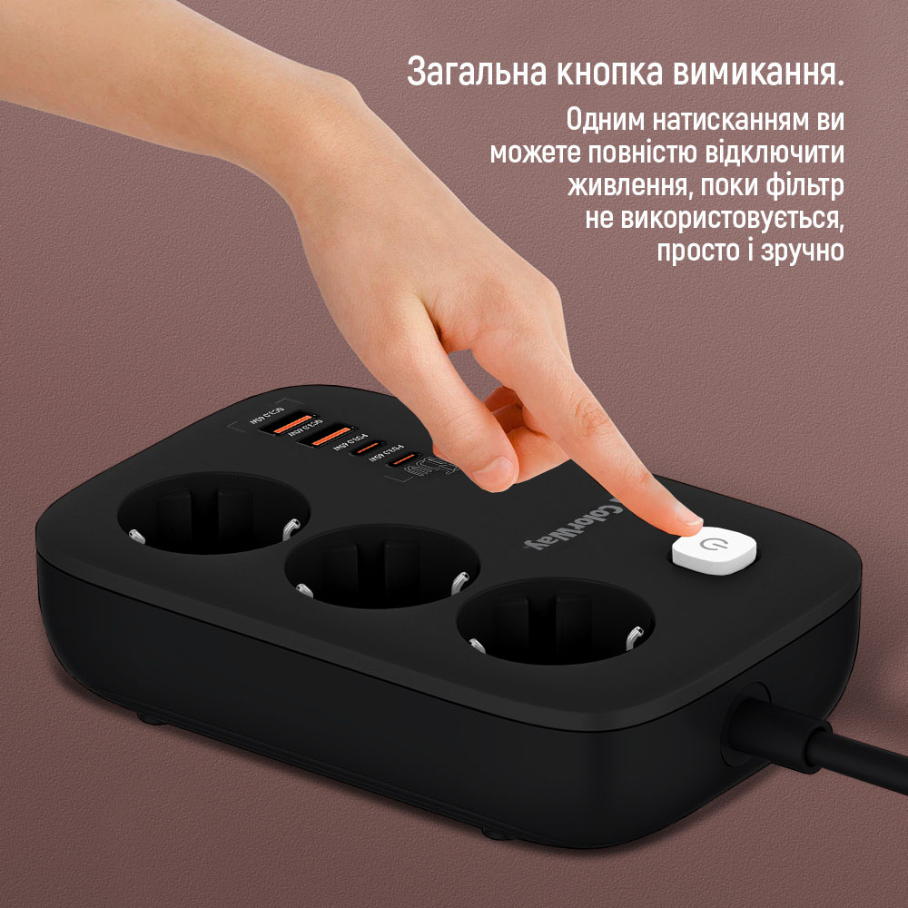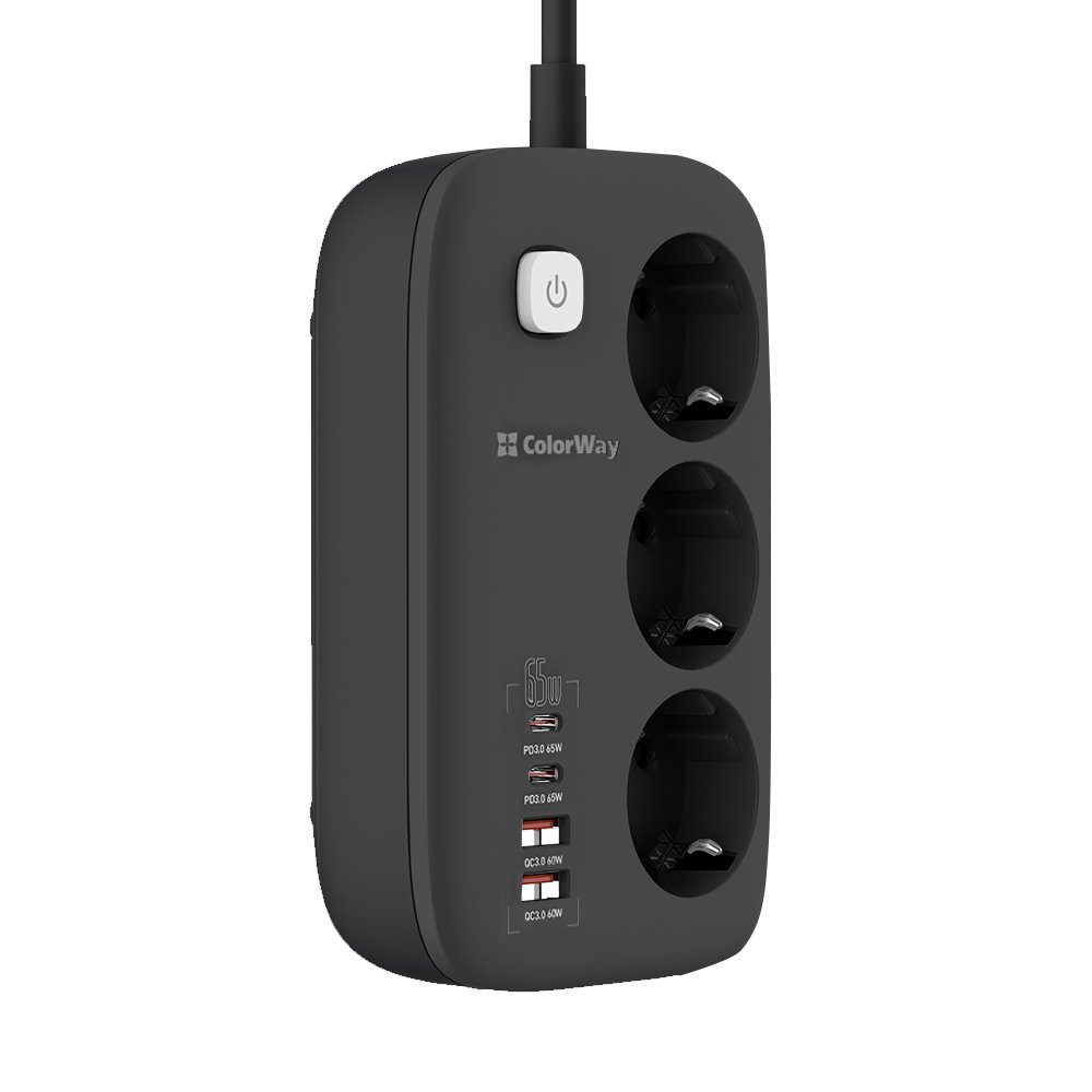 Характеристики Фильтр питания ColorWay CW-CHE34PDB GaN3 Pro PD 65W (2USB-A + 2 TYPE-C) 3 розетки, 4 USB, 2 м, черный