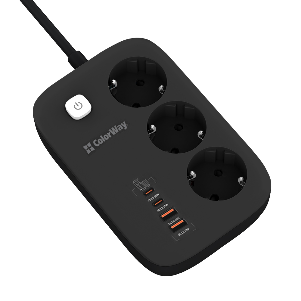 Фильтр питания ColorWay CW-CHE34PDB GaN3 Pro PD 65W (2USB-A + 2 TYPE-C) 3 розетки, 4 USB, 2 м, черный