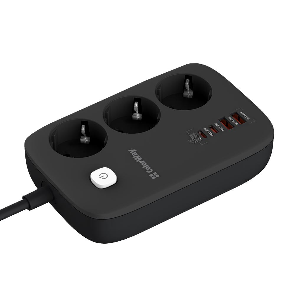 Компактный удлинитель с тремя сетевыми розетками 220В и с 2 портами USB, поддерживающими технологию быстрой зарядки Quick Charge 3.0/4.0, и 2 USB-C PD с поддержкой протоколов PD (Power Delivery) 2.0/3.0, 65W PPS; APPLE FAST CHARGE; SAMSUNG 5V-2A/AFC/SFC; QC2.0/3.0/4.0+; HUAWEI FCP/SCP,VOOC, XIAOMI 27W TURBO CHARGING. Устройство имеет продуманную конструкцию, позволяющую одновременно подключать не только электроприборы, но и одновременно заряжать до четырёх мобильных устройств без каких-либо затруднений. При этом технология интеллектуального контроля определяет и обеспечивает оптимальное напряжение для каждого девайса, тогда как специальный чип защищает от нагрузки, короткого замыкания или перегрева. Зарядное устройство относится к новому поколению, в котором вместо кремниевых транзисторов используют нитрид галлия. Благодаря этому зарядка практически не нагревается, потребляет меньше энергии и заряжает гаджеты быстрее обычных адаптеров питания. Максимальной мощности 65 Вт хватит, чтобы производить подзарядку не только небольших гаджетов, но и таких энергоёмких устройств, как ноутбуки. Удлинитель оснащён защитными шторками по технологии Child Security Door, а также с удобной кнопкой включения и выключения, и LED индикацией. Контактные группы розеток сделаны из высококачественного медного сплава. Корпус выполнен из жаропрочного пластика, способного выдержать температуру до 750C°.