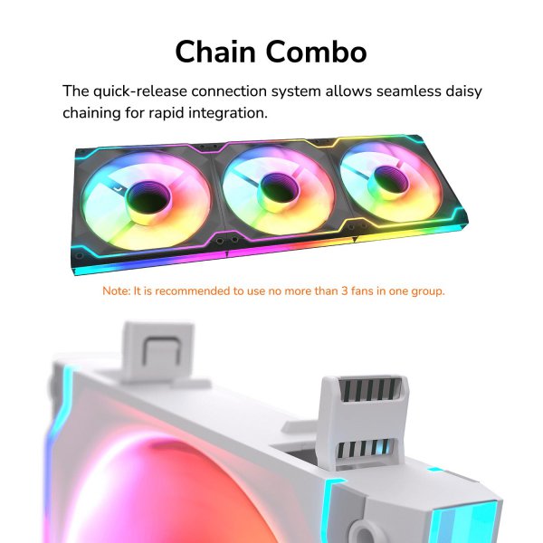 Система быстроразъемных соединений позволяет осуществлять бесшовное последовательное подключение для быстрой интеграции, гарантируя оптимальную эффективность воздушного потока: быстрая простая сборка без инструментов, позволяющая поддерживать охлаждение вашей системы без лишних хлопот. (Рекомендуемая конфигурация из-за ваших ограничений с источниками питания - не более 3 вентиляторов)