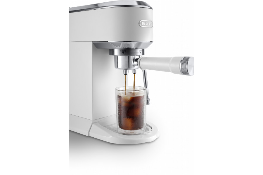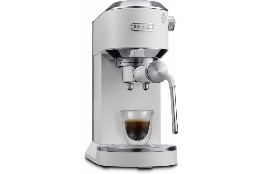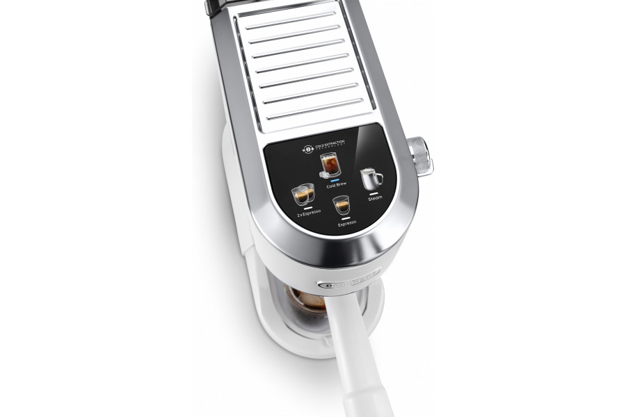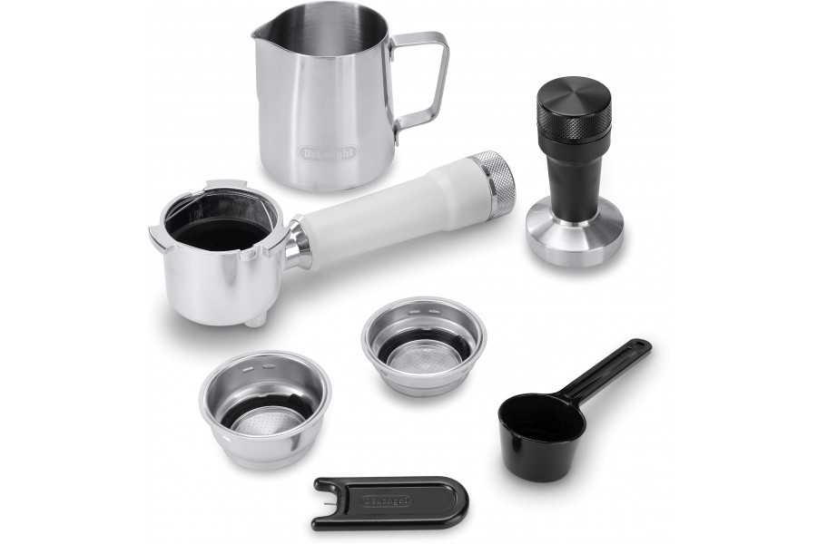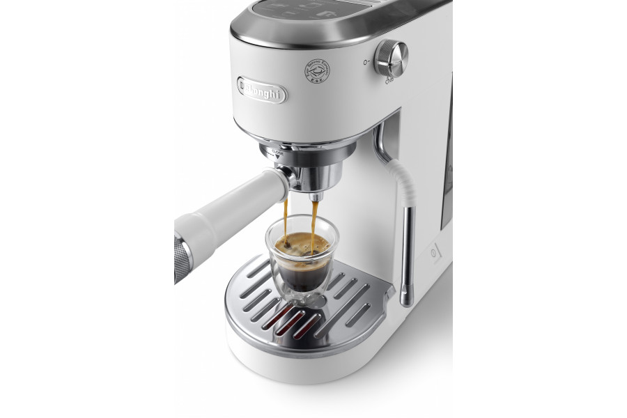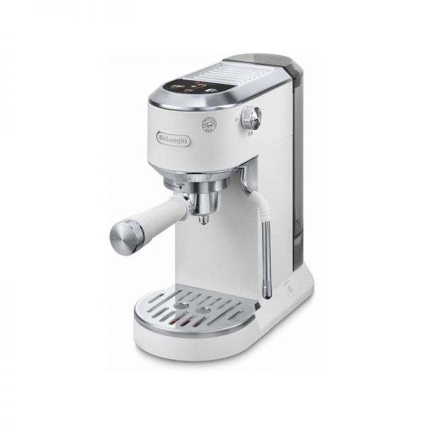 Рожковая кофеварка с мощностью 1450 Вт и сенсорным управлением. Оснащена дисплеем, работает с молотым кофе и чалдами. Система приготовления капучино из панарело, давление насоса 15 Бар. Возможность одновременного приготовления двух чашек, три крема-фильтра, индикация готовности к работе, противокапельная система. Резервуар для воды объемом 1,1л, лоток для сбора капель. Автоматическое выключение, подогрев чашек, система оповещения о накипи, счетчик порций, функция энергосбережения. Металлический корпус и рожок, цвет белый.