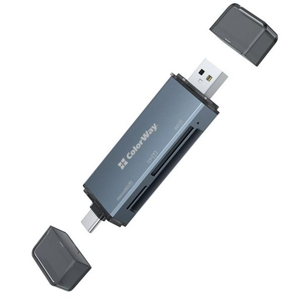Кардидер ColorWay 3-в-1 — компактное и стильное устройство в форме брелока для удобного считывания и записи данных с карт памяти. Оснащен сразу двумя коннекторами – USB-C и USB-A – что позволяет подключать его к ноутбукам, ПК, планшетам и смартфонам с поддержкой OTG. Поддерживает карты памяти форматов CF, SD и MicroSD (TF) до 2 ТБ.