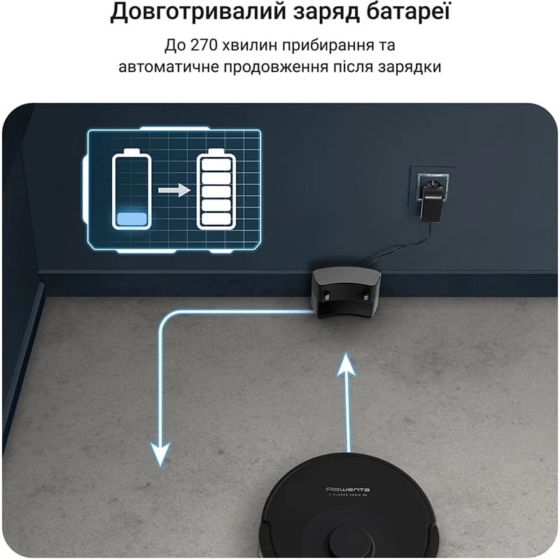 Длительный заряд батареи обеспечивает до 270 минут уборки, чтобы охватить до 270 квадратных метров пространства на одном заряде. А если робот разрядился не закончив уборку, он самостоятельно станет на зарядку и по завершении продолжит наведение чистоты.