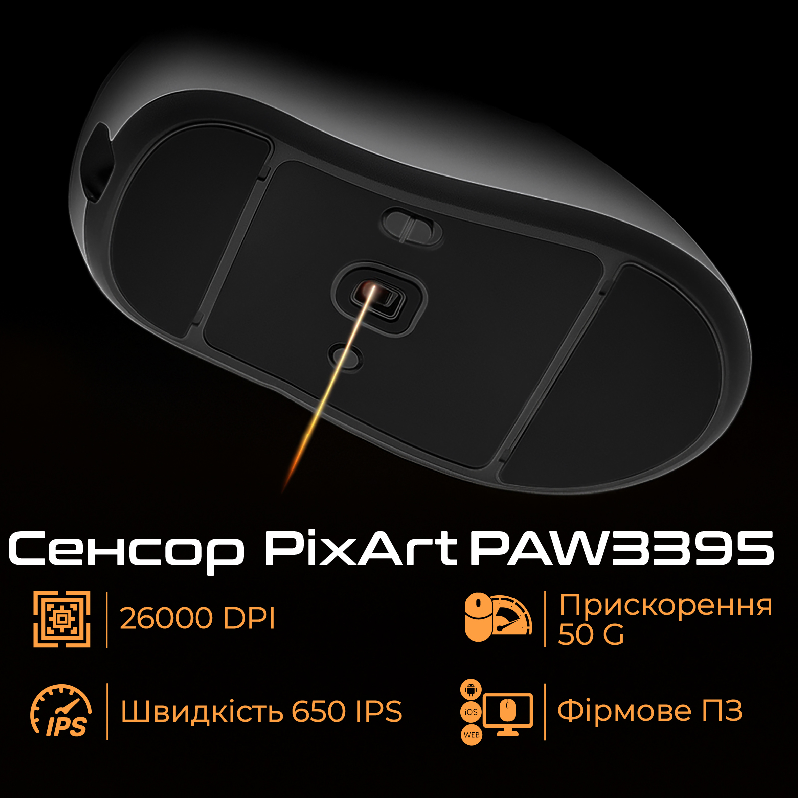 Сенсор PixArtPAW3395: ER21 оснащен высокопроизводительным оптическим сенсором PixArt PAW3395, поддерживающим до 26 000 DPI, скоростью 650 IPS и ускорением до 50g.