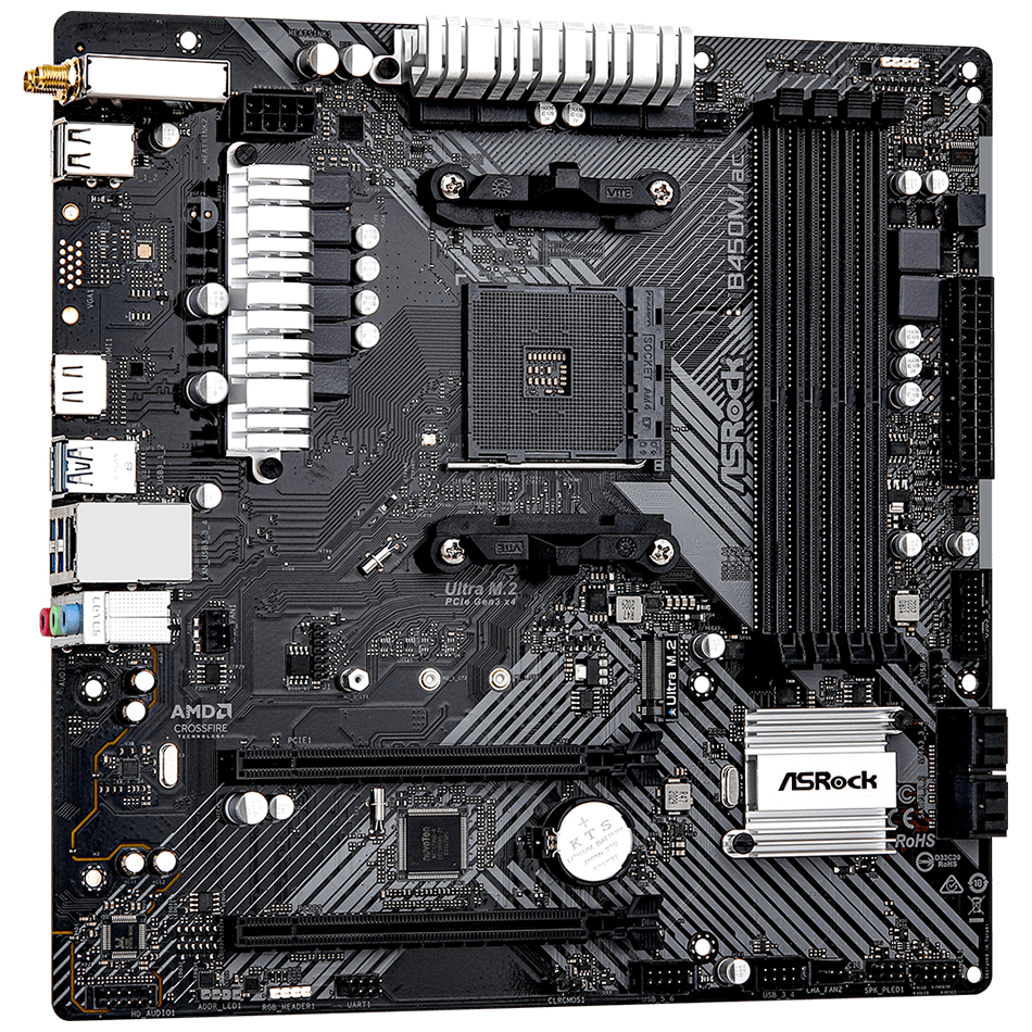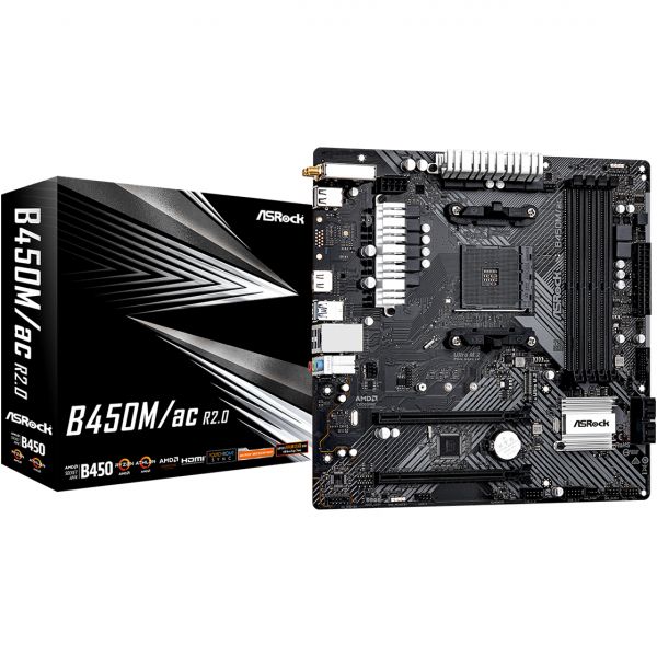 ASRock B450M/ac R2.0 – это материнская плата, предназначенная для процессоров AMD с сокетом AM4. Эта модель хорошо подходит для сборки бюджетных или компактных игровых или офисных компьютеров.