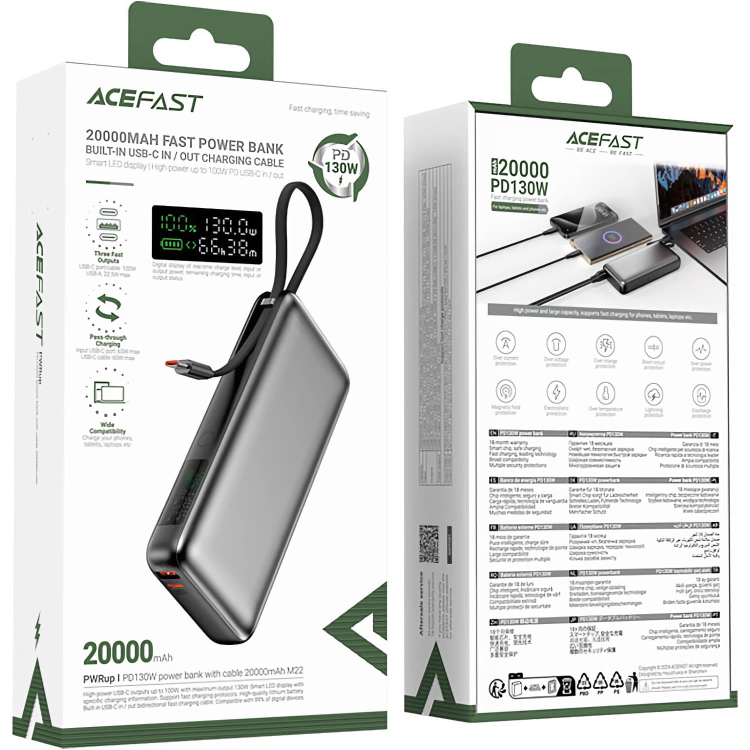 Универсальная мобильная батарея Acefast M22 емкостью 20000 мАч поможет быстро и безопасно пополнить заряд USB-устройств с общей выходной мощностью до 130 Вт. Она поддерживает большинство протоколов быстрой зарядки, в частности – PPS/PD3.0/PD2.0/QC4+/QC3.0/QC2.0/AFC/FCP/SCP.