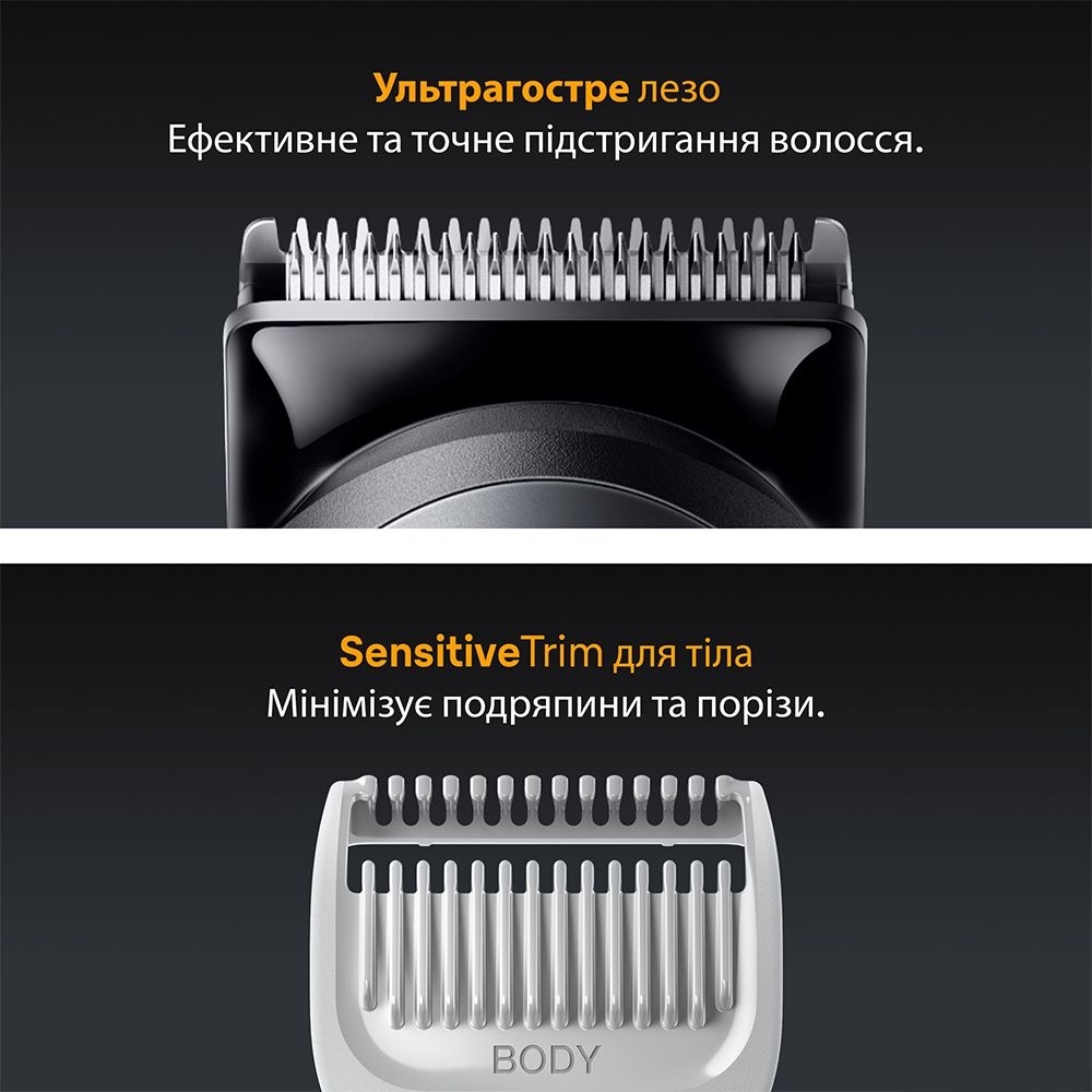Особенностью модели является расческа SensitiveTrim для чувствительных участков тела, которая позволяет безопасно подстригать волосы без раздражений даже в самых щепетильных зонах.