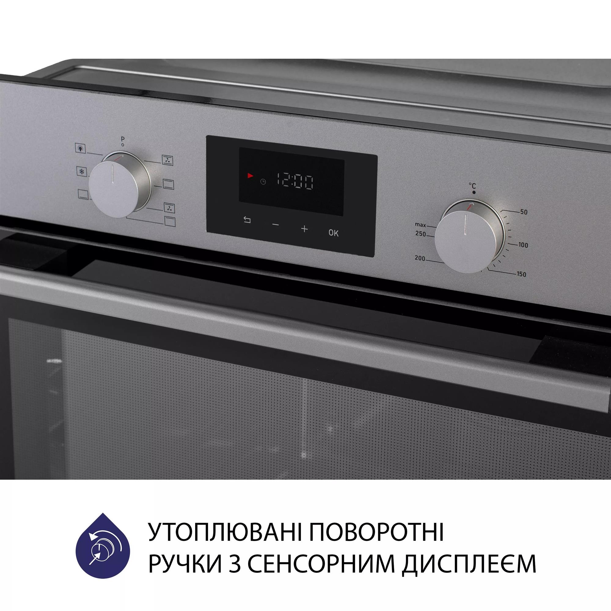 Управление духовым шкафом реализовано в виде поворотных утапливаемых ручек из термостойкого пластика и современного дисплея.