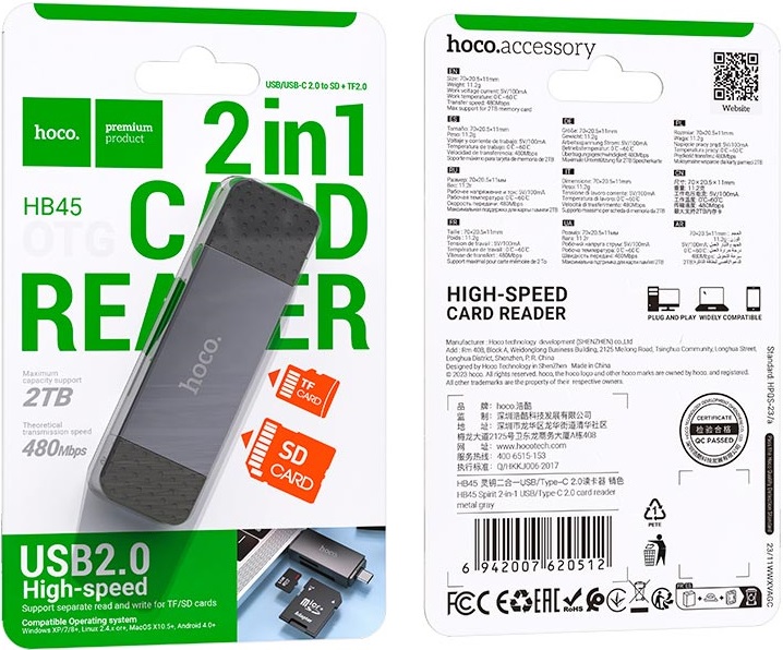 Hoco Spirit 2-in-1 HB45 – это мощный кардридер, поддерживающий SD и microSD карты памяти до 2TB.