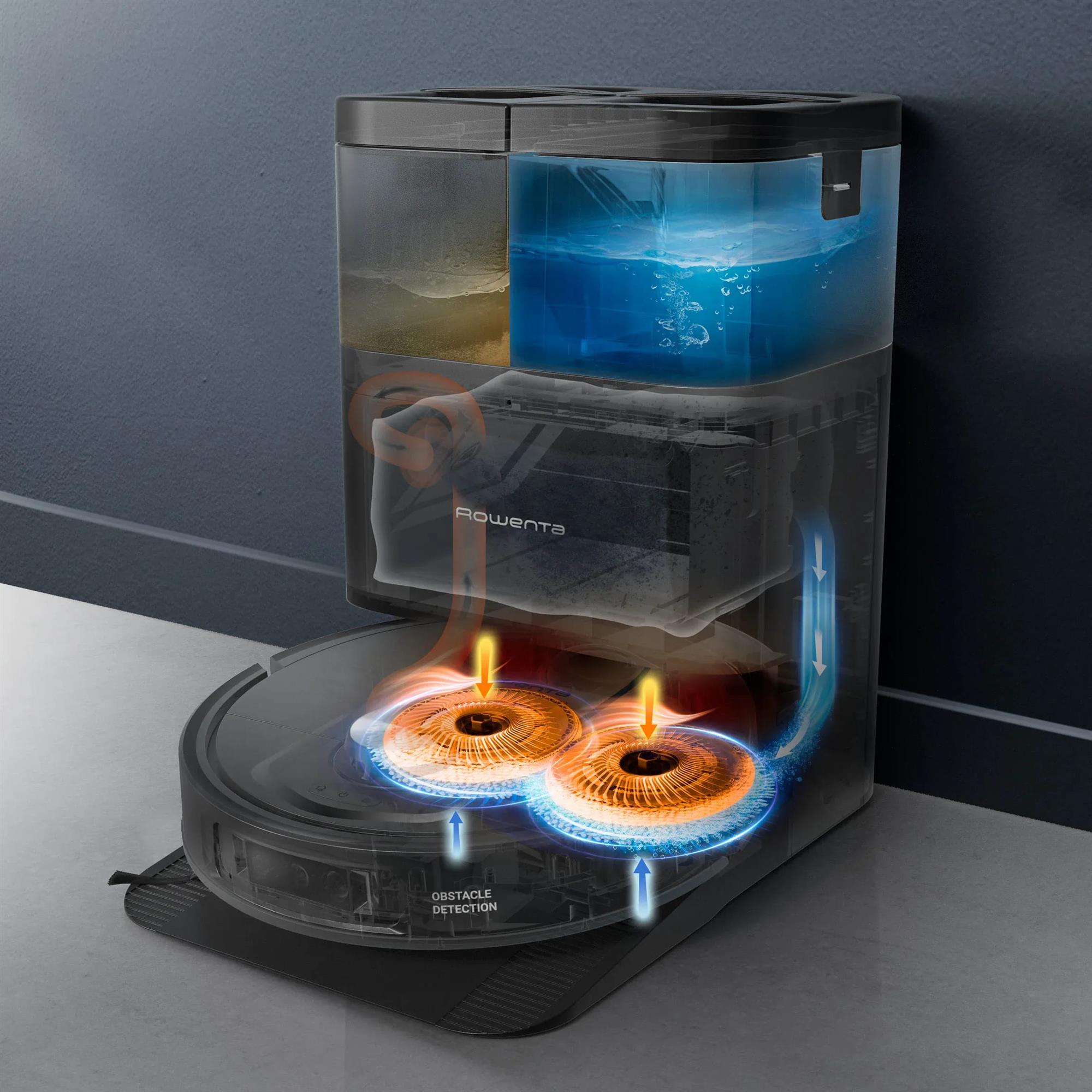 Полная делегация уборки с компактной станцией 4-в-1: автоматическая сушка горячим воздухом, автоматическая очистка мопов, автоматическое увлажнение мопов, автоматический сбор грязной воды, автоматическое опорожнение пылесборника.