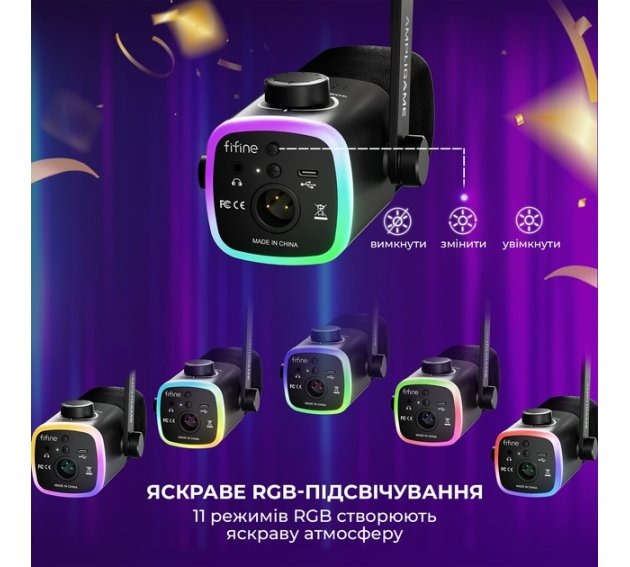 Микрофон FIFINE AM9 оснащен эффектной RGB подсветкой с 11 режимами, которая добавляет динамики и стиля вашему рабочему пространству. Вы можете выбрать мягкое сияние для спокойной атмосферы или яркие пульсирующие эффекты для стримов и игр. Подсветка не только создает настроение, но подчеркивает современный дизайн микрофона, делая его заметным элементом в любом сетапе.