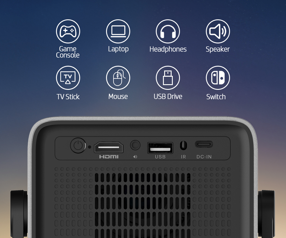 Создан для настоящей мобильности с USB-C-входом питания, который также поддерживает внешние аккумуляторы (65 Вт). Наслаждайтесь фильмами или презентациями в любом месте без необходимости подключения к розетке, что делает его идеальным для развлечений или работы в пути.