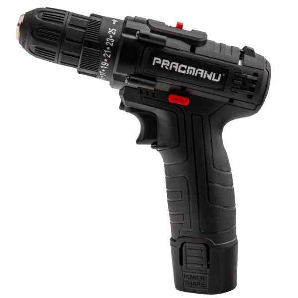 Аккумуляторный шуроповерт Pracmanu – ручной инструмент, который просто необходим для мелких домашних работ. Технические характеристики: Скорость холостого хода: 1 скорость: 0-350 об./мин. 2 скорость: 0-1250 об./мин. Номинальное напряжение: 12В Тип аккумуляторной батареи: литиевая Диаметр сверления: до 35 мм Крутящий момент: 32NM Вес: 1,2 кг В комплекте идет замечательный набор насадок делающий пользование шуруповерта максимально комфортным, а так же кейс для хранения и удобного переноса инструмента. Два режима работы: 1-я передача – невысокая скорость, подходит для завинчивания; 2-я высокоскоростная передача - для сверления.