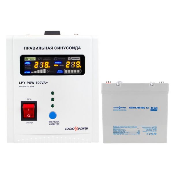 Комплект ИБП Logicpower LPY-PSW-500VA+(350Вт)5A/10A с правильной синусоидой 12В + Аккумулятор AGM LPM-MG 12V - 45 Ah специально подобран для обеспечения бесперебойного питания электрических газовых котлов, систем видеонаблюдения, компьютерной техники и других устройств, которые работают в режиме 24/7/365. ИБП (мощность 500/350 VA/W) с правильной синусоидой выполняет функции стабилизатора напряжения (на входе - 140-275V, на выходе - 220±10%). ИБП и аккумуляторная батарея надежно защищены от коротких замыканий и перегрузок. LPY-PSW-500VA+(350Вт)5A/10A имеет габаритные размеры 240х145х180 мм. Тип подключения к сети – евровилка, тип подключения нагрузки – евророзетка. На внешней стороне корпуса LСD экран, где отображаются параметры работы. Емкость батареи – 45 ампер/часов. Вес – 14.2 кг. Габаритные размеры: 229х138х230 Гарантия – 24 месяцев