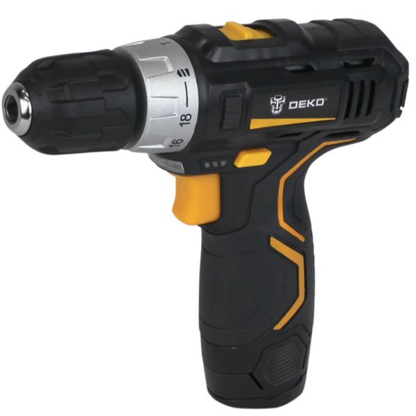 Аккумуляторный шуруповерт (дрель) DEKO 12 В с номинальным крутящим моментом 32 Н позволяет выполнять точное заворачивание шурупов, а также сверление в несложных условиях по дереву, металлу и пластику.