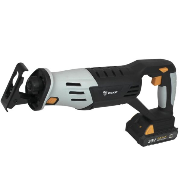 Беспроводная сабельная пила DEKO имеет постоянную Li-ion батарею 20V для точной и последовательной работы. Циферблат с регулируемой скоростью. Цельнометаллическое лезвие без ключа, которое позволяет быстро и легко менять лезвие, а также цельнометаллическое скошенное устройство для легкой резки.