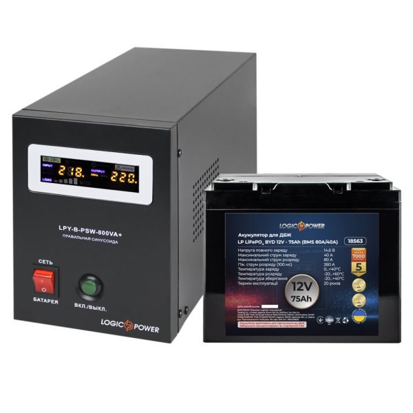 Комплект ИБП LPY-B-PSW-800VA+ (560Вт) 5A/15A + литиевая (LiFePO4) батарея BYD 12V - 75 Ah (BMS 80А/40A) специально подобран для обеспечения бесперебойного питания электрических газовых котлов, систем видеонаблюдения, компьютерной техники и других устройств, которые работают в 24/7/365. А также как источник бесперебойного питания для бомбоубежища.